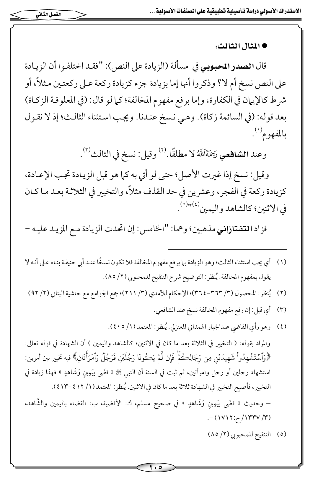 قال الصدر المحبوبي في مسألة (الزيادة على النص): "فقد اختلفوا أن الزيادة على النص نسخ أم لا؟ وذكروا أنها إما بزيادة جزء كزيادة ركعة على ركعتين مثلاً، أو شرط كالإيمان في الكفارة، وإما برفع مفهوم المخالفة؛ كما لو قال: (في المعلوفة الزكاة) بعد قوله: (في السائمة زكاة). وهي نسخ عندنا. ويجب استثناء الثالث؛ إذ لا نقول بالمفهوم (١).