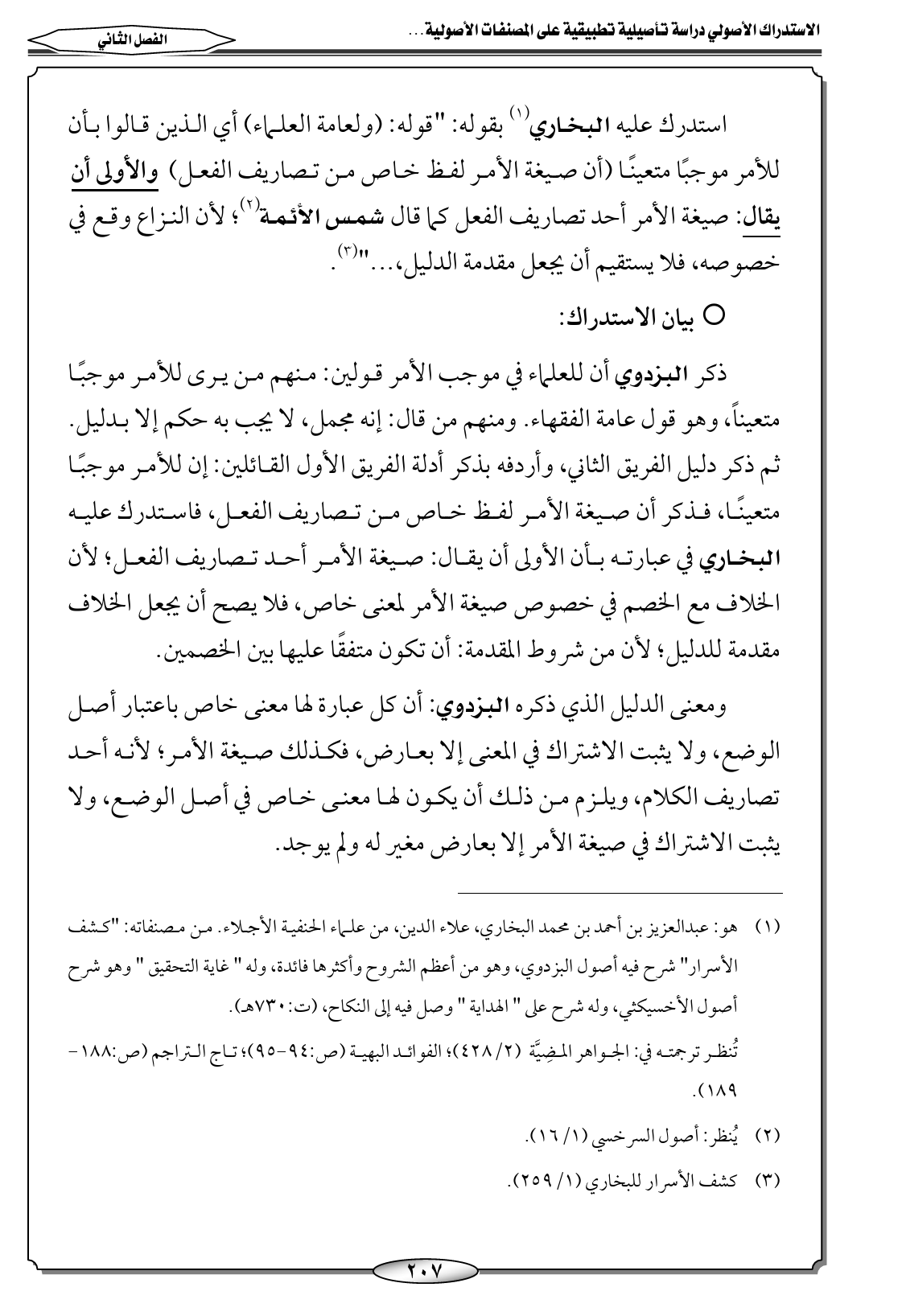ذكر البزدوي أن للعلماء في موجب الأمر قولين: منهم من يرى للأمر موجبًا متعيناً، وهو قول عامة الفقهاء. ومنهم من قال: إنه مجمل، لا يجب به حكم إلا بدليل. ثم ذكر دليل الفريق الثاني، وأردفه بذكر أدلة الفريق الأول القائلين: إن للأمر موجبًا متعينًا، فذكر أن صيغة الأمر لفظ خاص من تصاريف الفعل، فاستدرك عليه البخاري في عبارته بأن الأولى أن يقال: صيغة الأمر أحد تصاريف الفعل؛ لأن الخلاف مع الخصم في خصوص صيغة الأمر لمعنى خاص، فلا يصح أن يجعل الخلاف مقدمة للدليل؛ لأن من شروط المقدمة: أن تكون متفقًا عليها بين الخصمين.