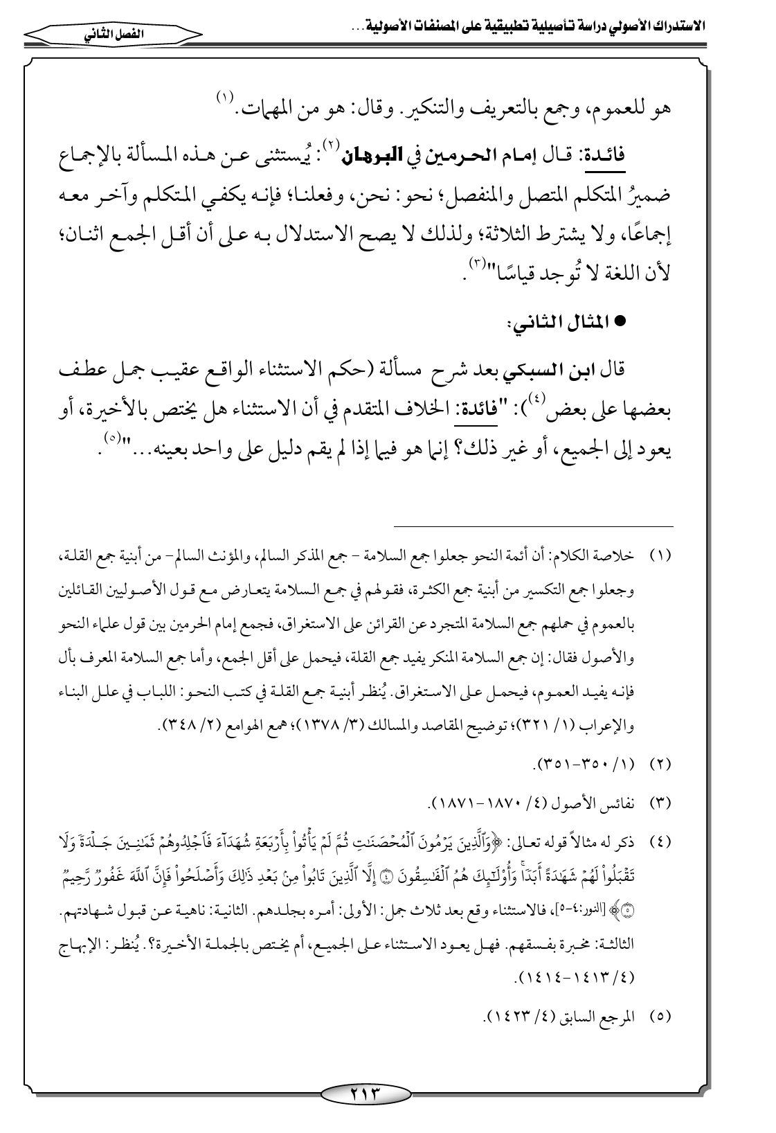 (٤) ذكر له مثالاً قوله تعالى: {وَالَّذِينَ يَرْمُونَ الْمُحْصَنَاتِ ثُمَّ لَمْ يَأْتُوا بِأَرْبَعَةِ شُهَدَاءَ فَاجْلِدُوهُمْ ثَمَانِينَ جَلْدَةً وَلَا تَقْبَلُوا لَهُمْ شَهَادَةً أَبَدًا وَأُوْلَئِكَ هُمُ الْفَاسِقُونَ (٤) إِلَّا الَّذِينَ تَابُوا مِن بَعْدِ ذَلِكَ وَأَصْلَحُوا فَإِنَّ اللَّهَ غَفُورٌ رَّحِيمٌ (٥)} [النور: ٤ - ٥]، فالاستثناء وقع بعد ثلاث جمل: الأولى: أمره بجلدهم. الثانية: ناهية عن قبول شهادتهم. الثالثة: مخبرة بفسقهم. فهل يعود الاستثناء على الجميع، أم يختص بالجملة الأخيرة؟ . يُنظر: الإبهاج (٤/ ١٤١٣ - ١٤١٤).