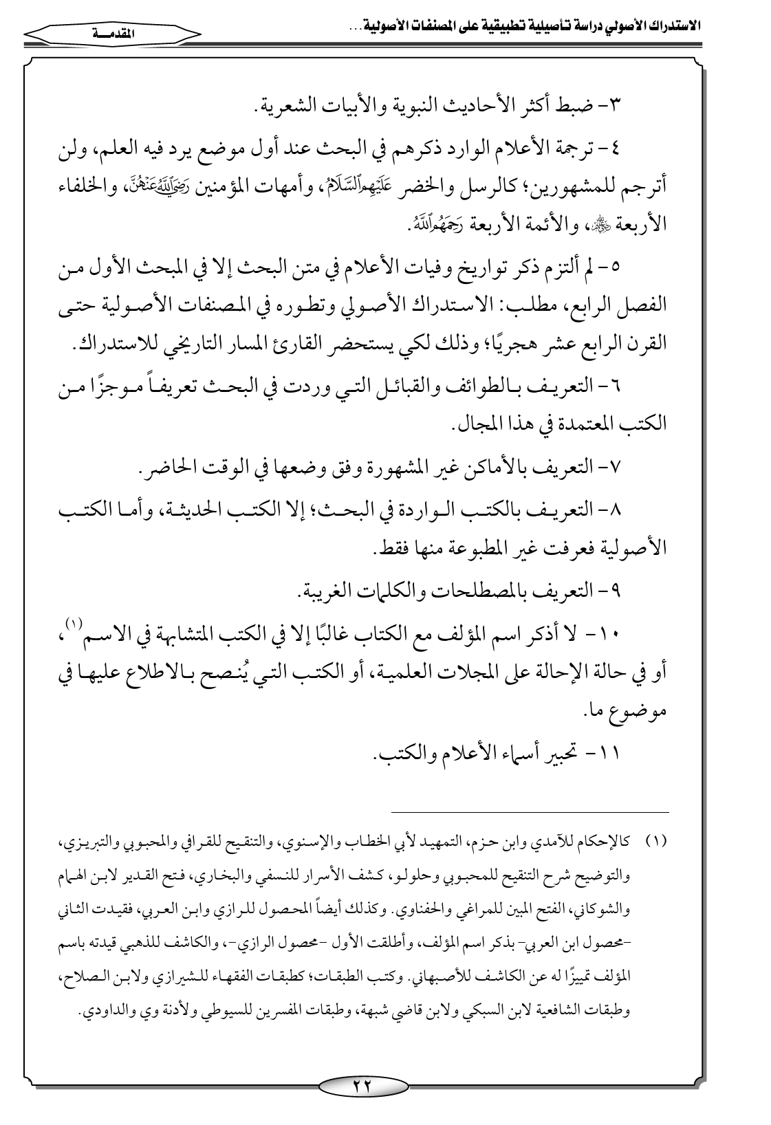 ٥ - لم ألتزم ذكر تواريخ وفيات الأعلام في متن البحث إلا في المبحث الأول من الفصل الرابع، مطلب: الاستدراك الأصولي وتطوره في المصنفات الأصولية حتى القرن الرابع عشر هجريًا؛ وذلك لكي يستحضر القارئ المسار التاريخي للاستدراك.