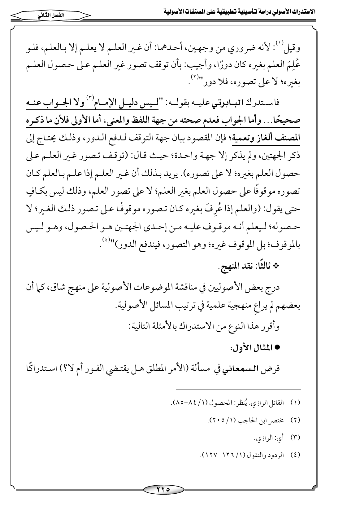 فاستدرك البابرتي عليه بقوله: "ليس دليل الإمام (٣) ولا الجواب عنه صحيحًا ... وأما الجواب فعدم صحته من جهة اللفظ والمعنى، أما الأولى فلأن ما ذكره المصنف ألغاز وتعمية؛ فإن المقصود بيان جهة التوقف لدفع الدور، وذلك يحتاج إلى ذكر الجهتين، ولم يذكر إلا جهة واحدة؛ حيث قال: (توقف تصور غير العلم على حصول العلم بغيره؛ لا على تصوره). يريد بذلك أن غير العلم إذا علم بالعلم كان تصوره موقوفًا على حصول العلم بغير العلم؛ لا على تصور العلم، وذلك ليس بكافٍ حتى يقول: (والعلم إذا عُرِفَ بغيره كان تصوره موقوفًا على تصور ذلك الغير؛ لا حصوله؛ ليعلم أنه موقوف عليه من إحدى الجهتين هو الحصول، وهو ليس بالموقوف؛ بل الموقوف غيره؛ وهو التصور، فيندفع الدور) " (٤).