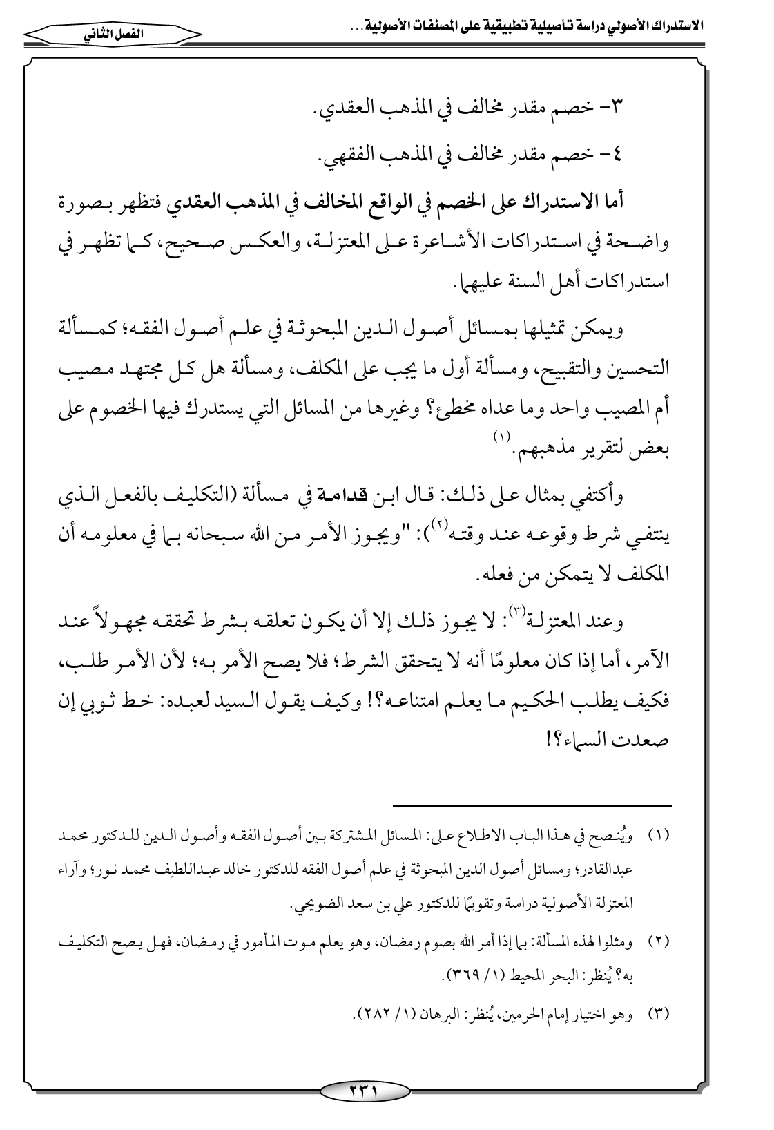 (١) ويُنصح في هذا الباب الاطلاع على: المسائل المشتركة بين أصول الفقه وأصول الدين للدكتور محمد عبدالقادر؛ ومسائل أصول الدين المبحوثة في علم أصول الفقه للدكتور خالد عبداللطيف محمد نور؛ وآراء المعتزلة الأصولية دراسة وتقويمًا للدكتور علي بن سعد الضويحي.