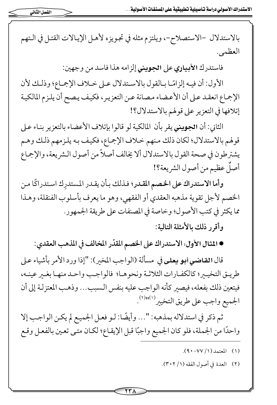 الثاني: أن الجويني يقر بأن المالكية لو قالوا بإتلاف الأعضاء بالتعزير بناء على قولهم بالاستدلال؛ لكان ذلك منهم خلاف الإجماع، فكيف به يلزمهم ذلك وهم يشترطون في صحة القول بالاستدلال ألا يخالف أصلاً من أصول الشريعة، والإجماع أصلٌ عظيم من أصول الشريعة؟ !