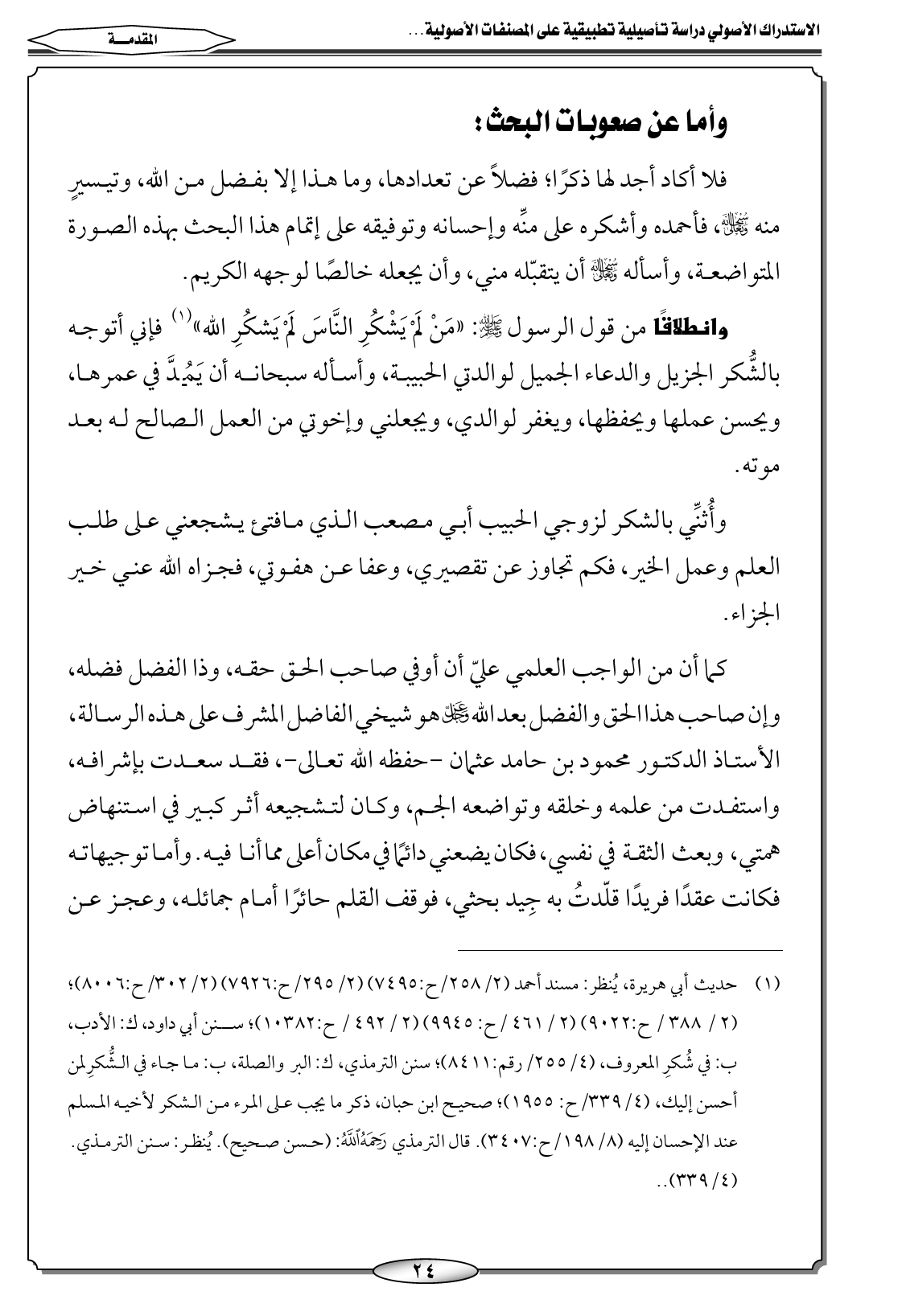 كما أن من الواجب العلمي عليّ أن أوفي صاحب الحق حقه، وذا الفضل فضله، وإن صاحب هذا الحق والفضل بعد الله - عز وجل - هو شيخي الفاضل المشرف على هذه الرسالة، الأستاذ الدكتور محمود بن حامد عثمان -حفظه الله تعالى-، فقد سعدت بإشرافه، واستفدت من علمه وخلقه وتواضعه الجم، وكان لتشجيعه أثر كبير في استنهاض همتي، وبعث الثقة في نفسي، فكان يضعني دائمًا في مكان أعلى مما أنا فيه. وأما توجيهاته فكانت عقدًا فريدًا قلّدتُ به جِيد بحثي، فوقف القلم حائرًا أمام جمائله، وعجز عن
