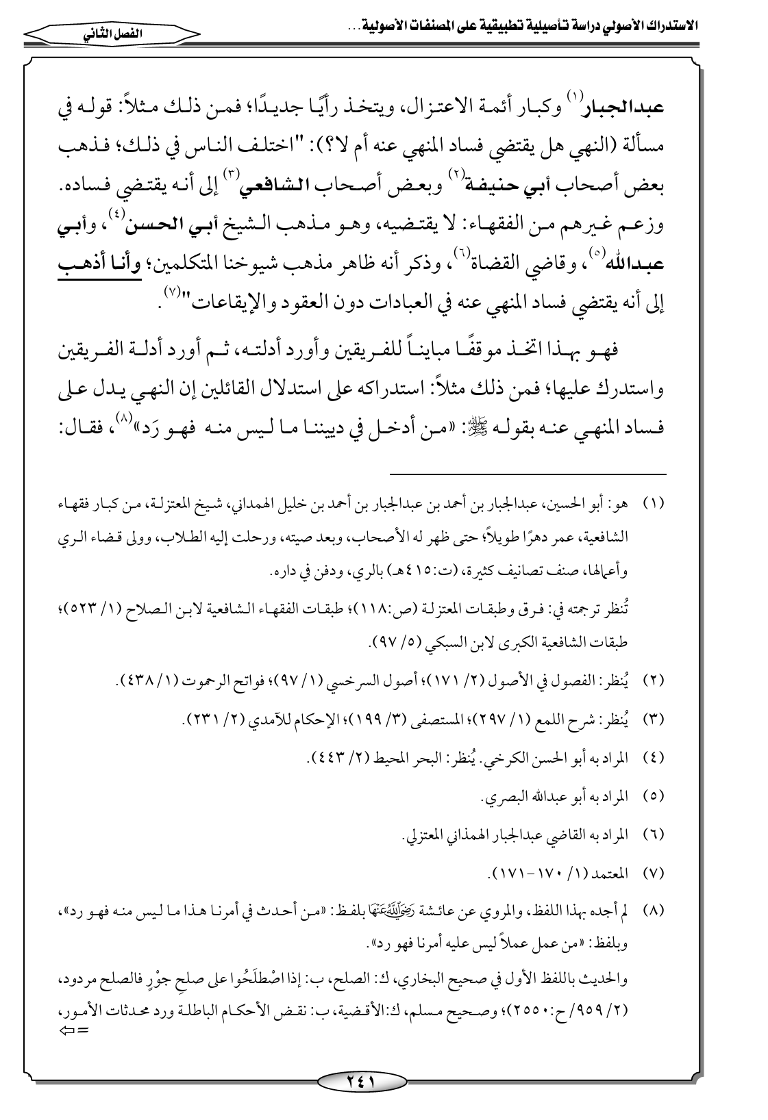 فهو بهذا اتخذ موقفًا مبايناً للفريقين وأورد أدلته، ثم أورد أدلة الفريقين واستدرك عليها؛ فمن ذلك مثلاً: استدراكه على استدلال القائلين إن النهي يدل على فساد المنهي عنه بقوله - صلى الله عليه وسلم -: «من أدخل في دييننا ما ليس منه فهو رَد» (٨)، فقال: