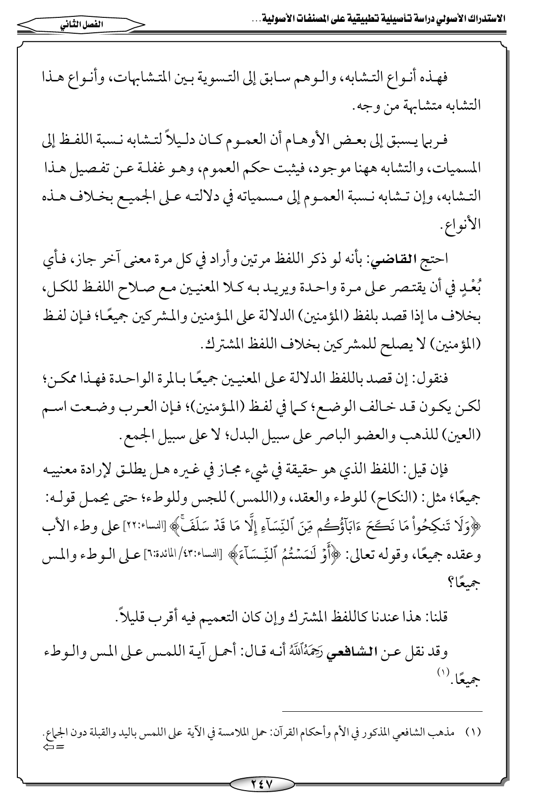 (١) مذهب الشافعي المذكور في الأم وأحكام القرآن: حمل الملامسة في الآية على اللمس باليد والقبلة دون الجماع. يُنظر: الأم (١/ ١٥)؛ أحكام القرآن للشافعي (١/ ٤٦). وذكر الجويني في البرهان أن ظاهر اختيار الشافعي حمل المشترك على جميع معانيه؛ وذلك لأنه قال في مفاوضة جرت له في قوله تعالى: {أَوْ لَامَسْتُمُ النِّسَاءَ} [النساء: ٤٣/ المائدة: ٦]، فقيل له: قد يراد بالملامسة المواقعة. قال: هي محمولة على اللمس باليد حقيقة، وعلى الوقاع مجازًا. يُنظر: البرهان (١/ ٣٤٣ - ٣٤٤).