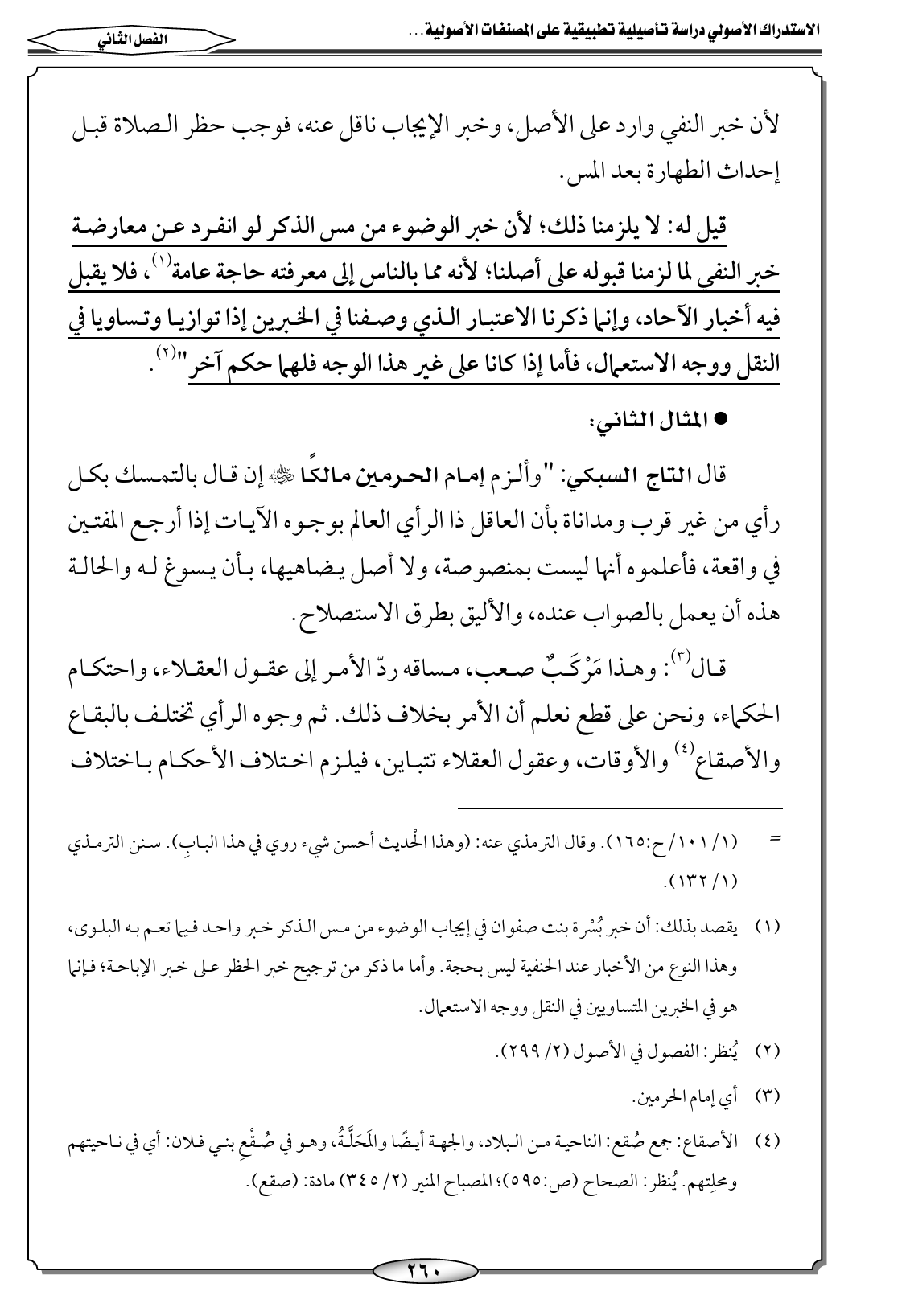 (١) يقصد بذلك: أن خبر بُسْرة بنت صفوان في إيجاب الوضوء من مس الذكر خبر واحد فيما تعم به البلوى، وهذا النوع من الأخبار عند الحنفية ليس بحجة. وأما ما ذكر من ترجيح خبر الحظر على خبر الإباحة؛ فإنما هو في الخبرين المتساويين في النقل ووجه الاستعمال.