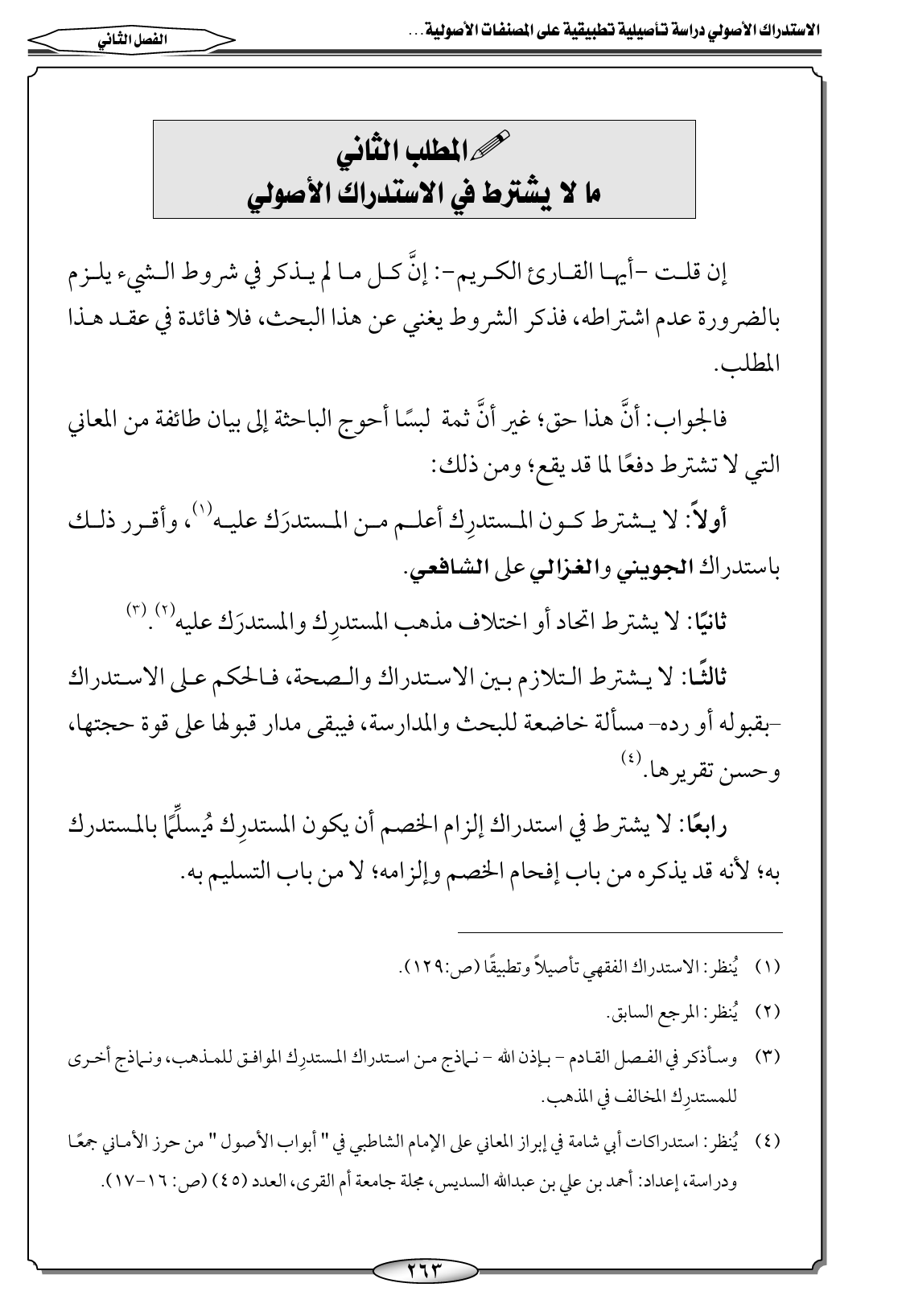 رابعًا: لا يشترط في استدراك إلزام الخصم أن يكون المستدرِك مُسلِّمًا بالمستدرك به؛ لأنه قد يذكره من باب إفحام الخصم وإلزامه؛ لا من باب التسليم به.