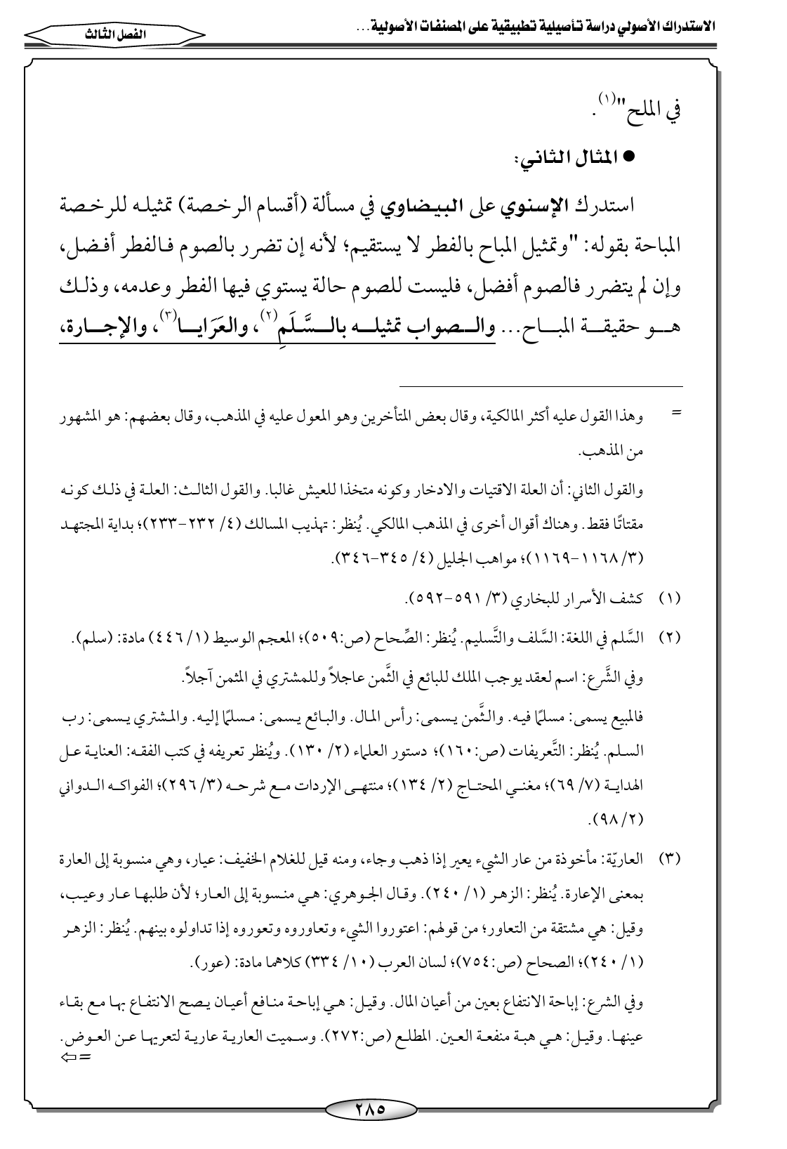 استدرك الإسنوي على البيضاوي في مسألة (أقسام الرخصة) تمثيله للرخصة المباحة بقوله: "وتمثيل المباح بالفطر لا يستقيم؛ لأنه إن تضرر بالصوم فالفطر أفضل، وإن لم يتضرر فالصوم أفضل، فليست للصوم حالة يستوي فيها الفطر وعدمه، وذلك هو حقيقة المباح ... والصواب تمثيله بالسَّلَمِ (٢)، والعَرَايا (٣)، والإجارة،