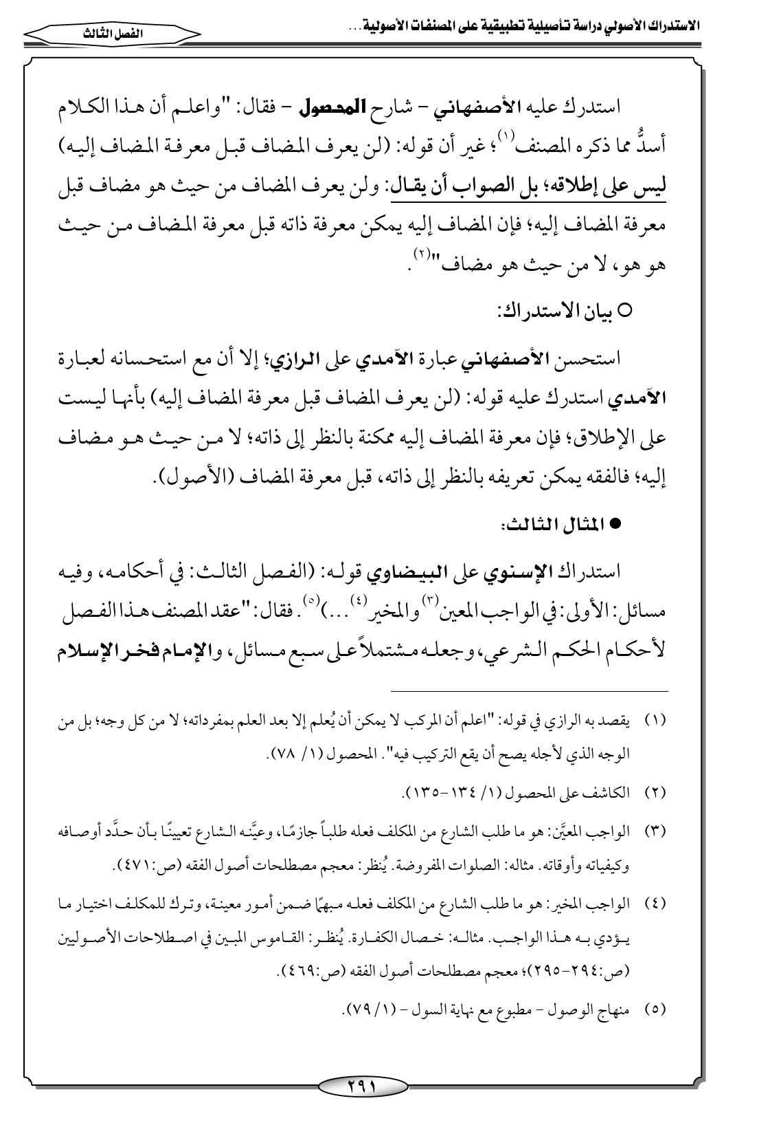 استحسن الأصفهاني عبارة الآمدي على الرازي؛ إلا أن مع استحسانه لعبارة الآمدي استدرك عليه قوله: (لن يعرف المضاف قبل معرفة المضاف إليه) بأنها ليست على الإطلاق؛ فإن معرفة المضاف إليه ممكنة بالنظر إلى ذاته؛ لا من حيث هو مضاف إليه؛ فالفقه يمكن تعريفه بالنظر إلى ذاته، قبل معرفة المضاف (الأصول).