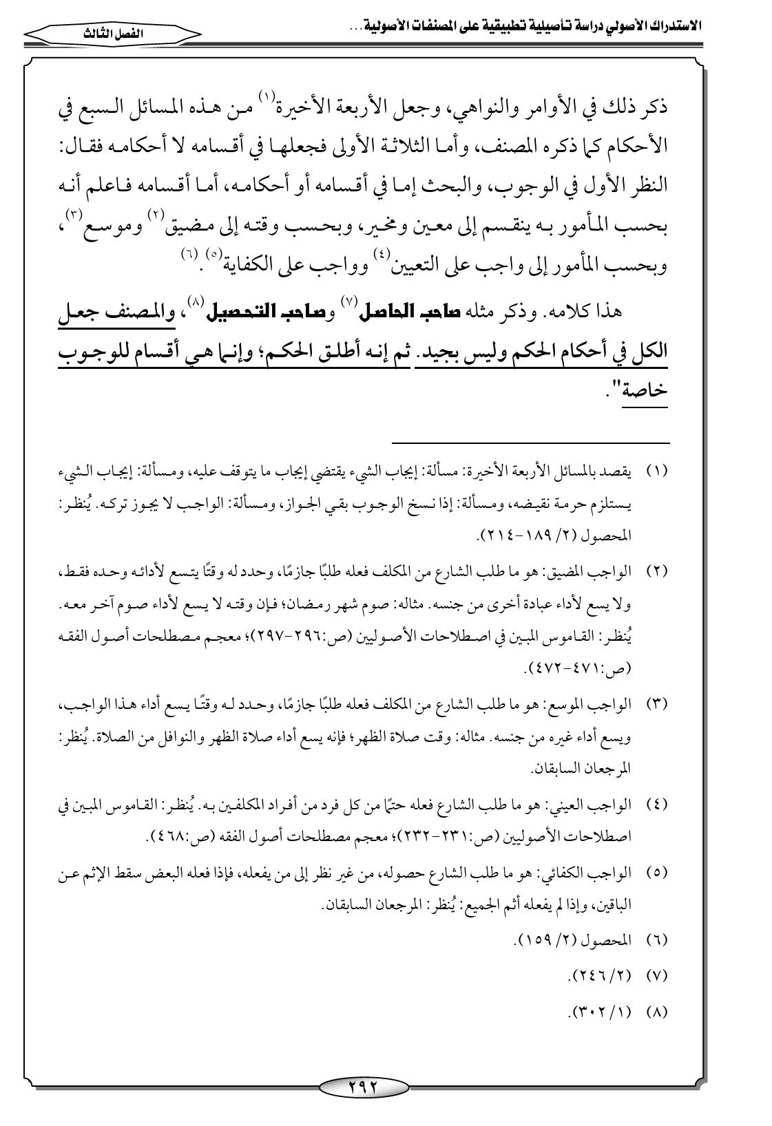 هذا كلامه. وذكر مثله صاحب الحاصل (٧) وصاحب التحصيل (٨)، والمصنف جعل الكل في أحكام الحكم وليس بجيد. ثم إنه أطلق الحكم؛ وإنما هي أقسام للوجوب خاصة".