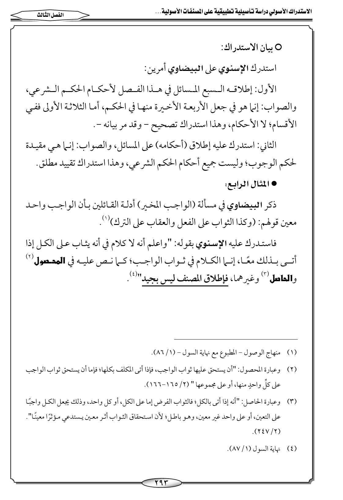 فاستدرك عليه الإسنوي بقوله: "واعلم أنه لا كلام في أنه يثاب على الكل إذا أتى بذلك معًا، إنما الكلام في ثواب الواجب؛ كما نص عليه في المحصول (٢) والحاصل (٣) وغيرهما، فإطلاق المصنف ليس بجيد" (٤).