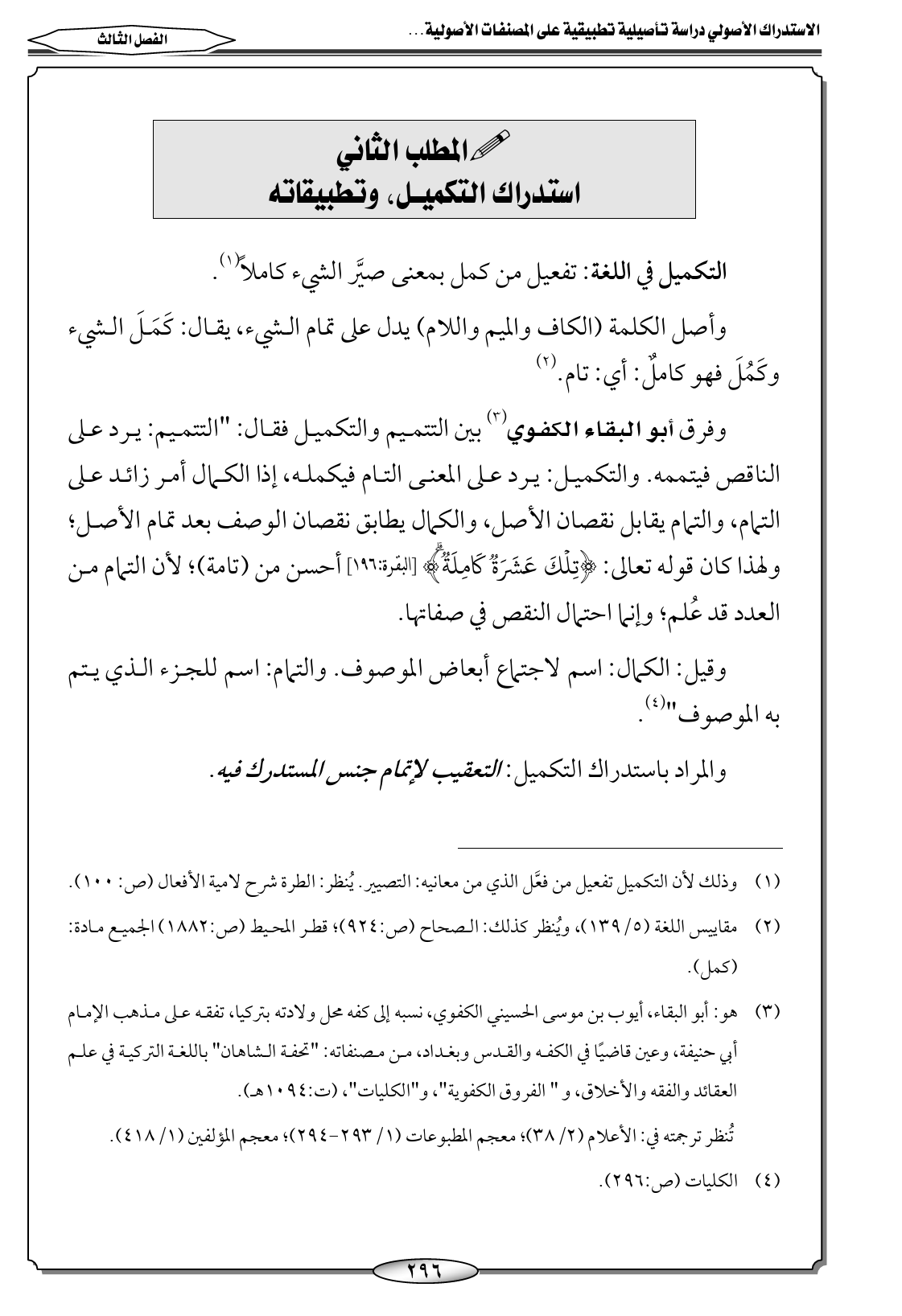 (٣) هو: أبو البقاء، أيوب بن موسى الحسيني الكفوي، نسبه إلى كفه محل ولادته بتركيا، تفقه على مذهب الإمام أبي حنيفة، وعين قاضيًا في الكفه والقدس وبغداد، من مصنفاته: "تحفة الشاهان" باللغة التركية في علم العقائد والفقه والأخلاق، و " الفروق الكفوية"، و"الكليات"، (ت: ١٠٩٤ هـ).