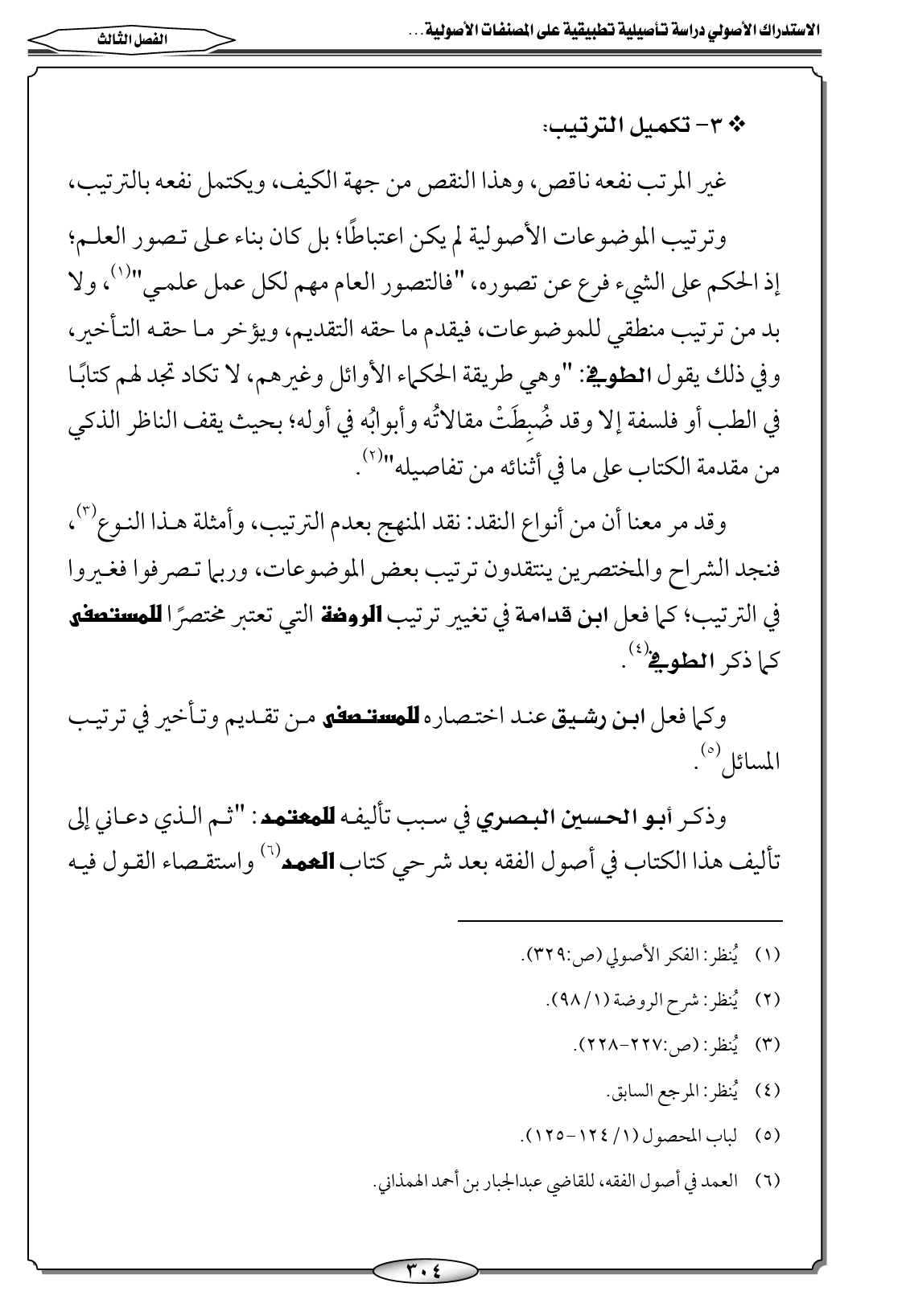 وقد مر معنا أن من أنواع النقد: نقد المنهج بعدم الترتيب، وأمثلة هذا النوع (٣)، فنجد الشراح والمختصرين ينتقدون ترتيب بعض الموضوعات، وربما تصرفوا فغيروا في الترتيب؛ كما فعل ابن قدامة في تغيير ترتيب الروضة التي تعتبر مختصرًا للمستصفى كما ذكر الطوفي (٤).