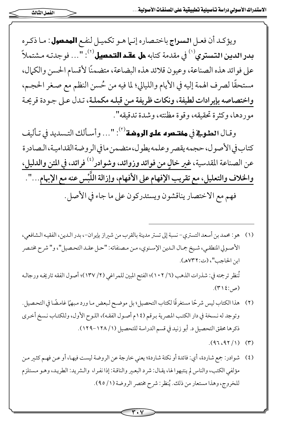 ويؤكد أن فعل السراج باختصاره إنما هو تكميل لنفع المحصول: ما ذكره بدر الدين التستري (١) في مقدمة كتابه حل عقد التحصيل (٢): " ... فوجدته مشتملاً على فوائد هذه الصناعة، وعيون قلائد هذه البضاعة، متضمنًا لأقسام الحسن والكمال، مستحقًا لصرف الهمة إليه في الأيام والليالي؛ لما فيه من حُسن النظم مع صغر الحجم، واختصاصه بإيرادات لطيفة، ونكات ظريفة من قبله مكملة، تدل على جودة قريحة موردها، وكثرة تحقيقه، وقوة مظنته، وشدة تدقيقه".