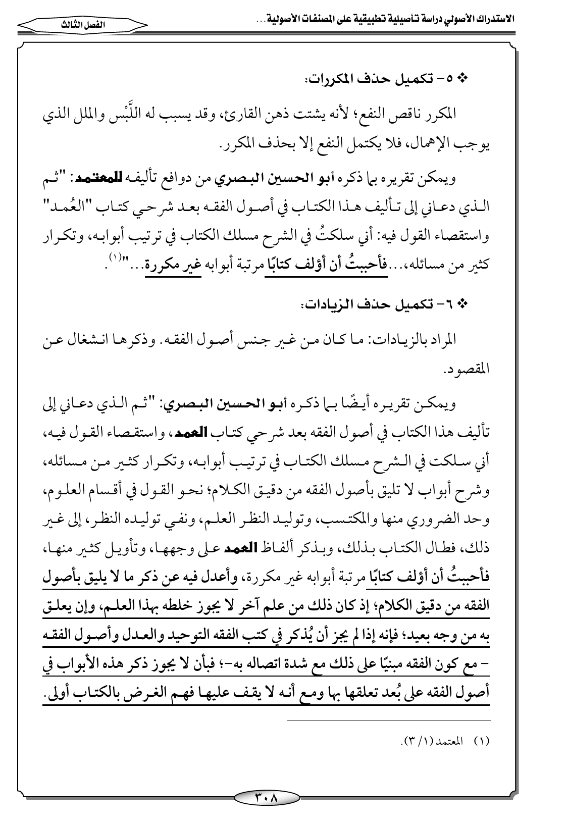 ويمكن تقريره أيضًا بما ذكره أبو الحسين البصري: "ثم الذي دعاني إلى تأليف هذا الكتاب في أصول الفقه بعد شرحي كتاب العمد، واستقصاء القول فيه، أني سلكت في الشرح مسلك الكتاب في ترتيب أبوابه، وتكرار كثير من مسائله، وشرح أبواب لا تليق بأصول الفقه من دقيق الكلام؛ نحو القول في أقسام العلوم، وحد الضروري منها والمكتسب، وتوليد النظر العلم، ونفي توليده النظر، إلى غير ذلك، فطال الكتاب بذلك، وبذكر ألفاظ العمد على وجهها، وتأويل كثير منها، فأحببتُ أن أؤلف كتابًا مرتبة أبوابه غير مكررة، وأعدل فيه عن ذكر ما لا يليق بأصول الفقه من دقيق الكلام؛ إذ كان ذلك من علم آخر لا يجوز خلطه بهذا العلم، وإن يعلق به من وجه بعيد؛ فإنه إذا لم يجز أن يُذكر في كتب الفقه التوحيد والعدل وأصول الفقه - مع كون الفقه مبنيًا على ذلك مع شدة اتصاله به-؛ فبأن لا يجوز ذكر هذه الأبواب في أصول الفقه على بُعد تعلقها بها ومع أنه لا يقف عليها فهم الغرض بالكتاب أولى.
