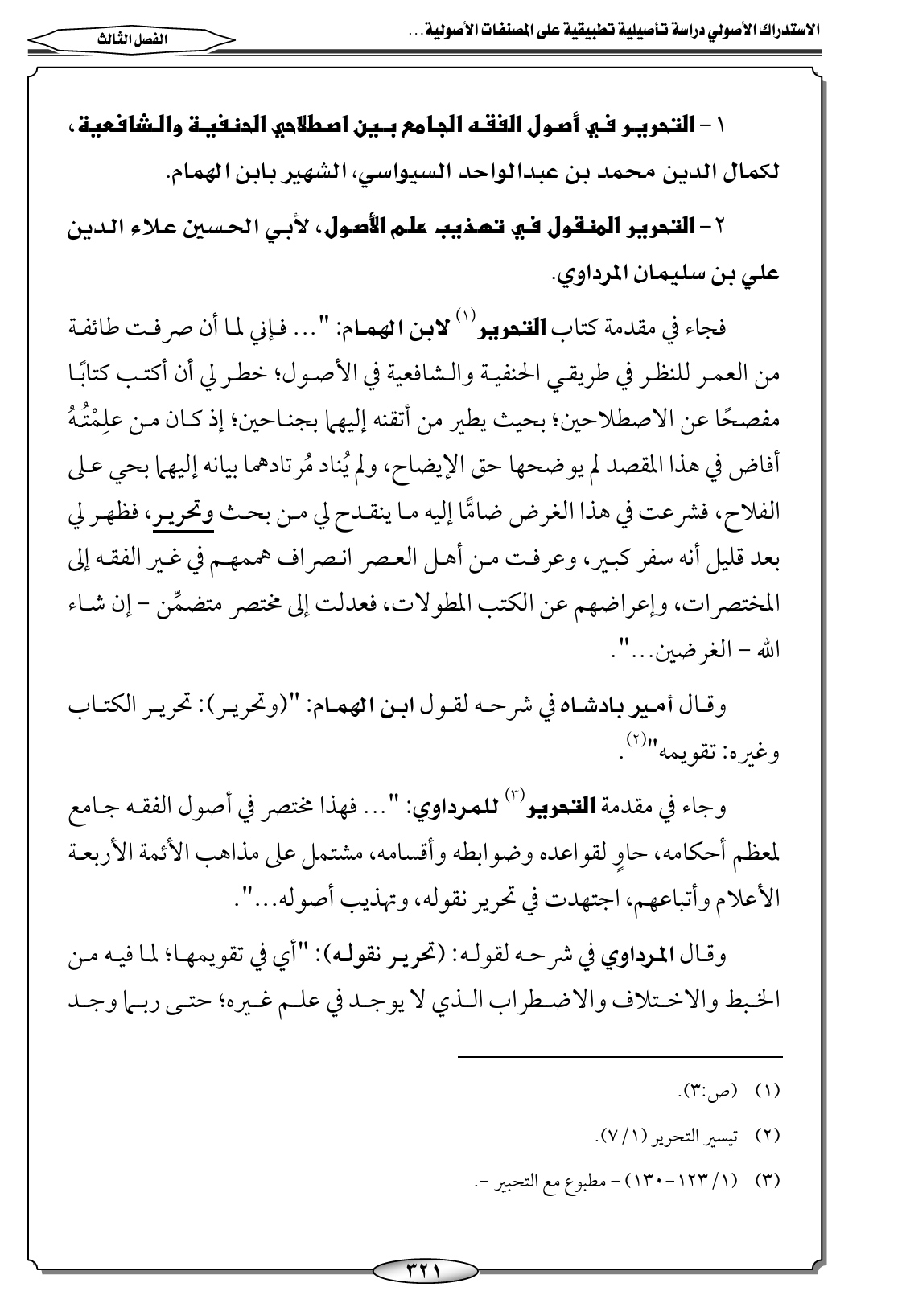 ١ - التحرير في أصول الفقه الجامع بين اصطلاحي الحنفية والشافعية، لكمال الدين محمد بن عبدالواحد السيواسي، الشهير بابن الهمام.