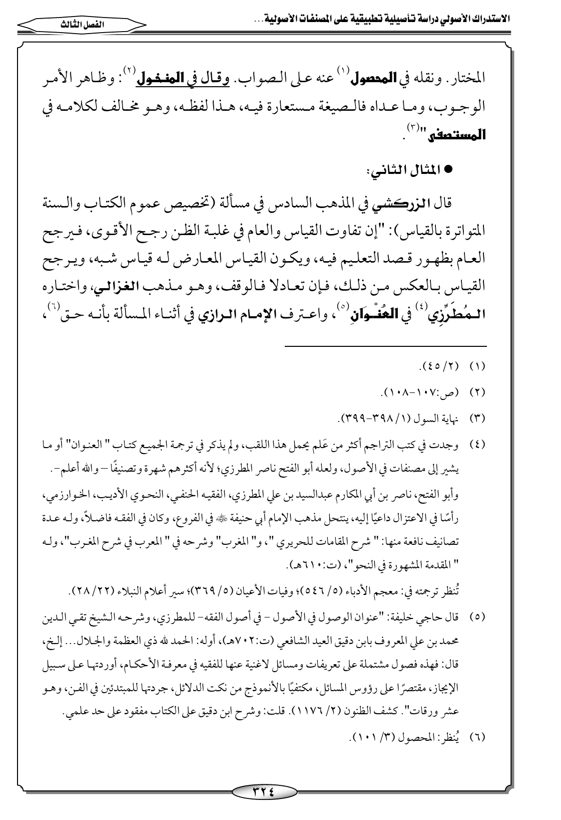 (٤) وجدت في كتب التراجم أكثر من عَلم يحمل هذا اللقب، ولم يذكر في ترجمة الجميع كتاب " العنوان" أو ما يشير إلى مصنفات في الأصول، ولعله أبو الفتح ناصر المطرزي؛ لأنه أكثرهم شهرة وتصنيفًا - والله أعلم-.