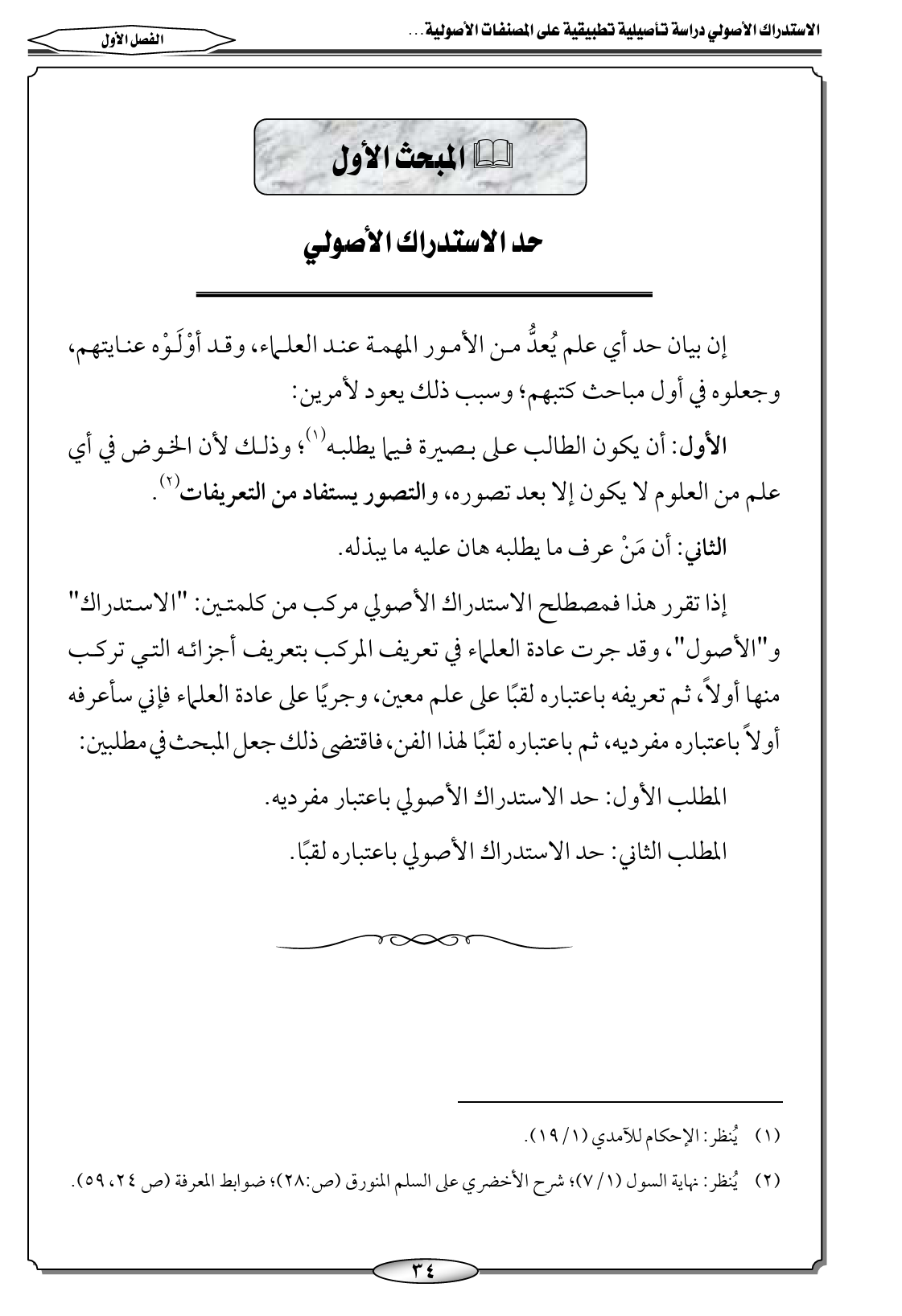 إذا تقرر هذا فمصطلح الاستدراك الأصولي مركب من كلمتين: "الاستدراك" و"الأصول"، وقد جرت عادة العلماء في تعريف المركب بتعريف أجزائه التي تركب منها أولاً، ثم تعريفه باعتباره لقبًا على علم معين، وجريًا على عادة العلماء فإني سأعرفه أولاً باعتباره مفرديه، ثم باعتباره لقبًا لهذا الفن، فاقتضى ذلك جعل المبحث في مطلبين: