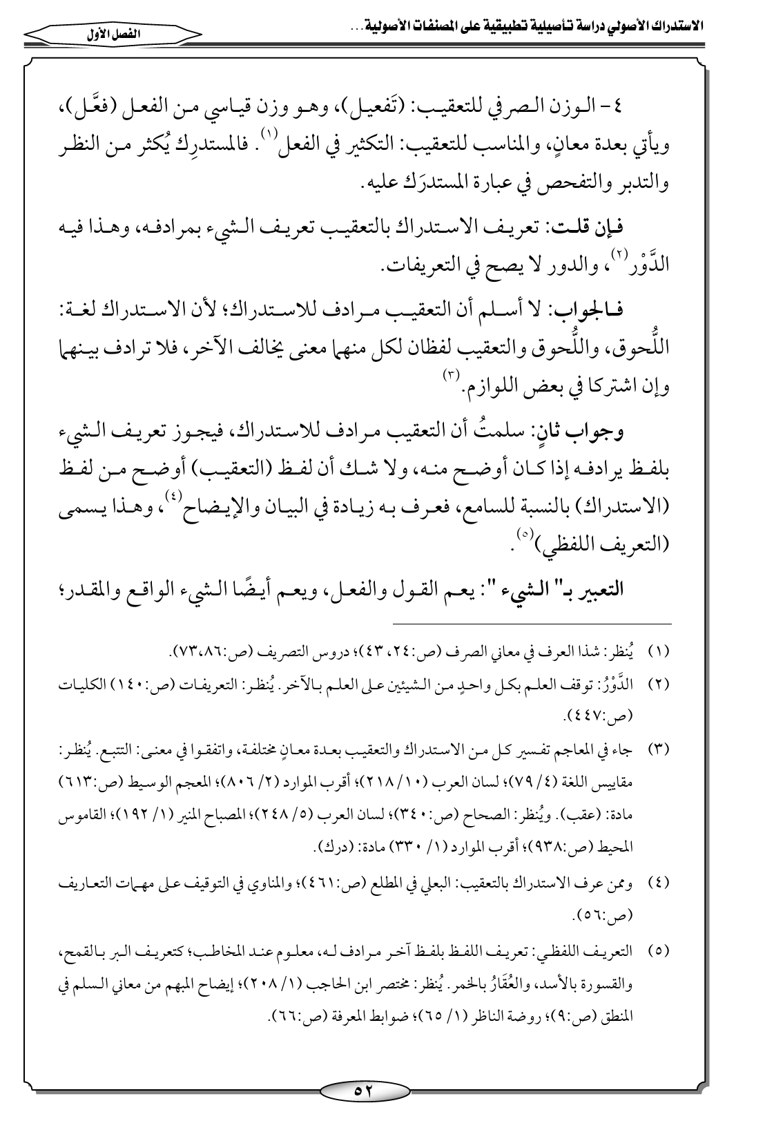 (٤) وممن عرف الاستدراك بالتعقيب: البعلي في المطلع (ص: ٤٦١)؛ والمناوي في التوقيف على مهمات التعاريف (ص: ٥٦).
