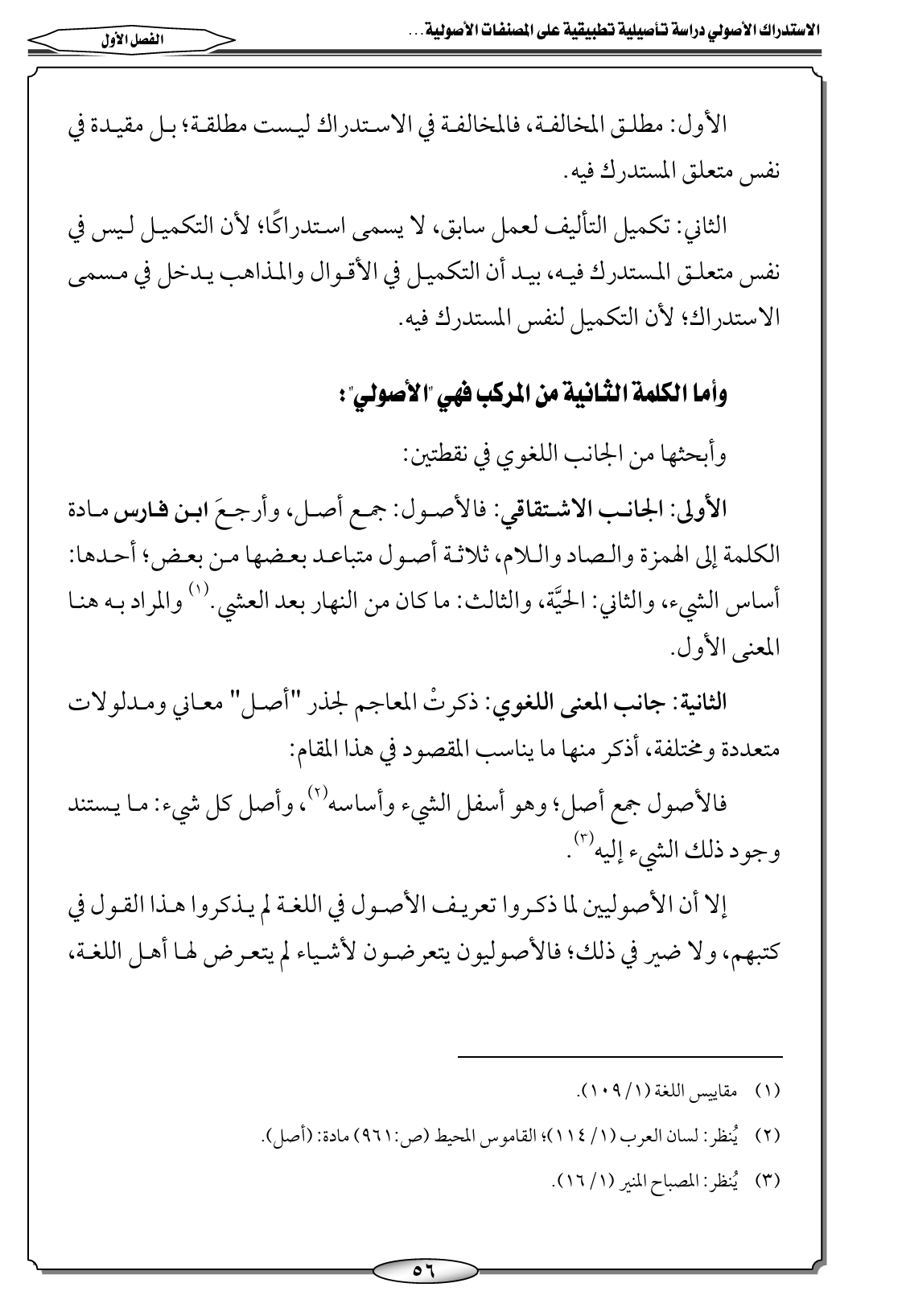 الأولى: الجانب الاشتقاقي: فالأصول: جمع أصل، وأرجعَ ابن فارس مادة الكلمة إلى الهمزة والصاد واللام، ثلاثة أصول متباعد بعضها من بعض؛ أحدها: أساس الشيء، والثاني: الحيَّة، والثالث: ما كان من النهار بعد العشي. (١) والمراد به هنا المعنى الأول.