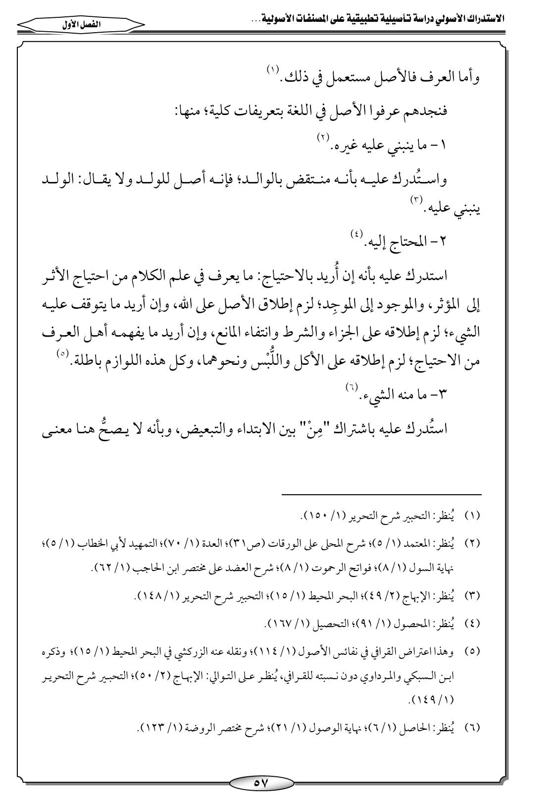 (٥) وهذا اعتراض القرافي في نفائس الأصول (١/ ١١٤)؛ ونقله عنه الزركشي في البحر المحيط (١/ ١٥)؛ وذكره ابن السبكي والمرداوي دون نسبته للقرافي، يُنظر على التوالي: الإبهاج (٢/ ٥٠)؛ التحبير شرح التحرير (١/ ١٤٩).