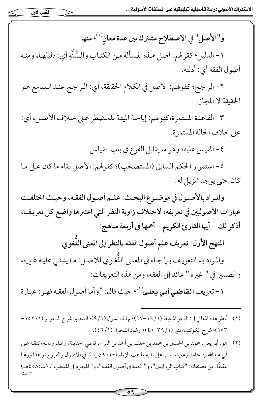 (١) يُنظر هذه المعاني في: البحر المحيط (١/ ١٦ - ١٧)؛ نهاية السول (١/ ٩)؛ التحبير شرح التحرير (١/ ١٥٢ - ١٥٣)؛ شرح الكوكب المنير (١/ ٣٩ - ٤٠)؛ إرشاد الفحول (١/ ٤٦).