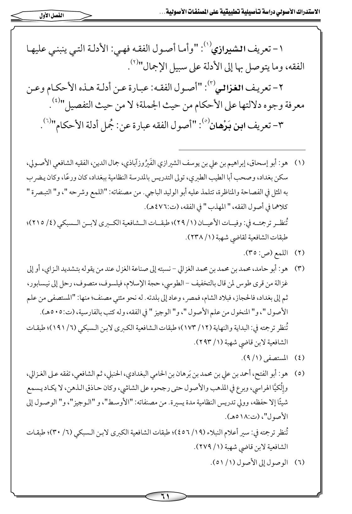 ١ - تعريف الشيرازي (١): "وأما أصول الفقه فهي: الأدلة التي ينبني عليها الفقه، وما يتوصل بها إلى الأدلة على سبيل الإجمال" (٢).