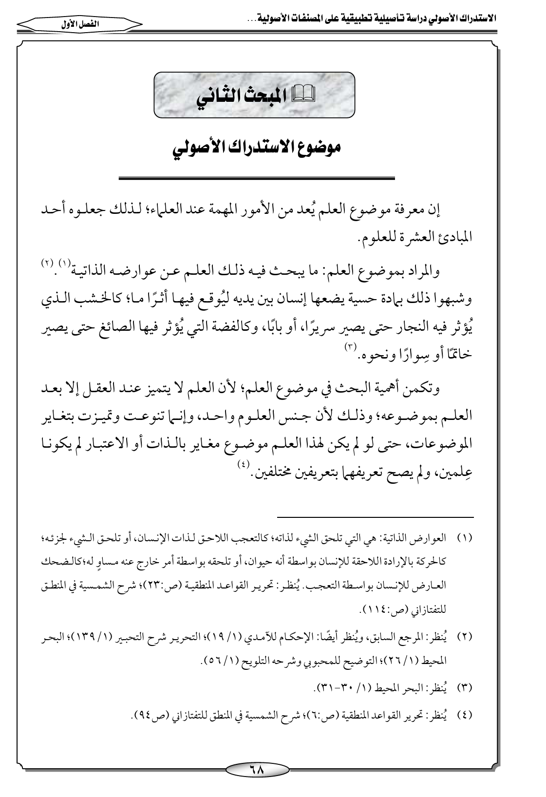 والمراد بموضوع العلم: ما يبحث فيه ذلك العلم عن عوارضه الذاتية (١). (٢) وشبهوا ذلك بمادة حسية يضعها إنسان بين يديه ليُوقع فيها أثرًا ما؛ كالخشب الذي يُؤثر فيه النجار حتى يصير سريرًا، أو بابًا، وكالفضة التي يُؤثر فيها الصائغ حتى يصير خاتمًا أو سِوارًا ونحوه. (٣)