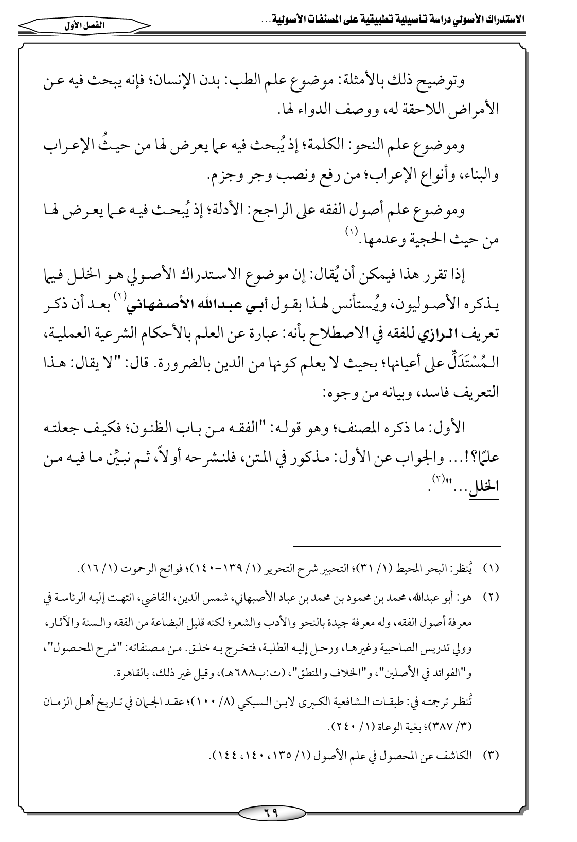إذا تقرر هذا فيمكن أن يُقال: إن موضوع الاستدراك الأصولي هو الخلل فيما يذكره الأصوليون، ويُستأنس لهذا بقول أبي عبدالله الأصفهاني (٢) بعد أن ذكر تعريف الرازي للفقه في الاصطلاح بأنه: عبارة عن العلم بالأحكام الشرعية العملية، المُسْتَدَلِّ على أعيانها؛ بحيث لا يعلم كونها من الدين بالضرورة. قال: "لا يقال: هذا التعريف فاسد، وبيانه من وجوه: