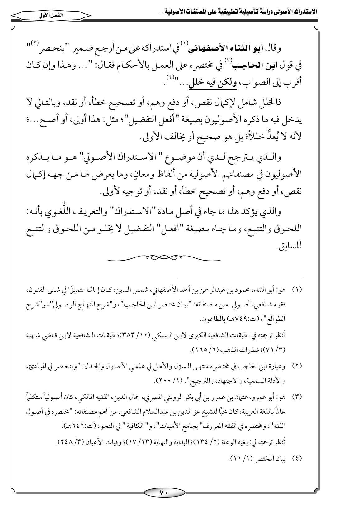 (٣) هو: أبو عمرو، عثمان بن عمرو بن أبي بكر الرويني المصري، جمال الدين، الفقيه المالكي، كان أصولياً متكلماً عالماً باللغة العربية، كان محبًّا للشيخ عز الدين بن عبدالسلام الشافعي. من أهم مصنفاته: "مختصره في أصول الفقه"، ومختصره في الفقه المعروف" بجامع الأمهات"، و" الكافية " في النحو، (ت: ٦٤٦ هـ).