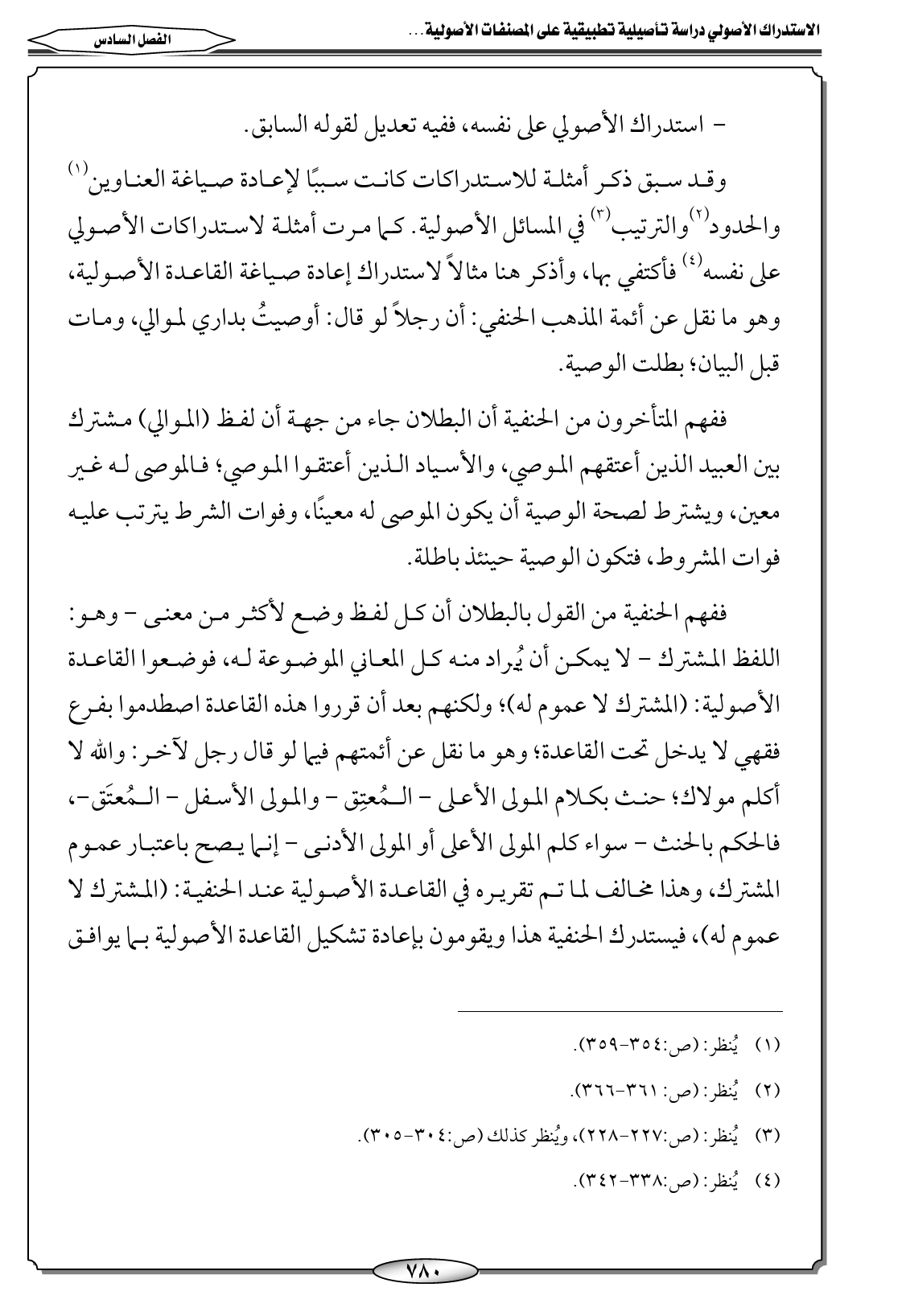 وقد سبق ذكر أمثلة للاستدراكات كانت سببًا لإعادة صياغة العناوين (١) والحدود (٢) والترتيب (٣) في المسائل الأصولية. كما مرت أمثلة لاستدراكات الأصولي على نفسه (٤) فأكتفي بها، وأذكر هنا مثالاً لاستدراك إعادة صياغة القاعدة الأصولية، وهو ما نقل عن أئمة المذهب الحنفي: أن رجلاً لو قال: أوصيتُ بداري لموالي، ومات قبل البيان؛ بطلت الوصية.