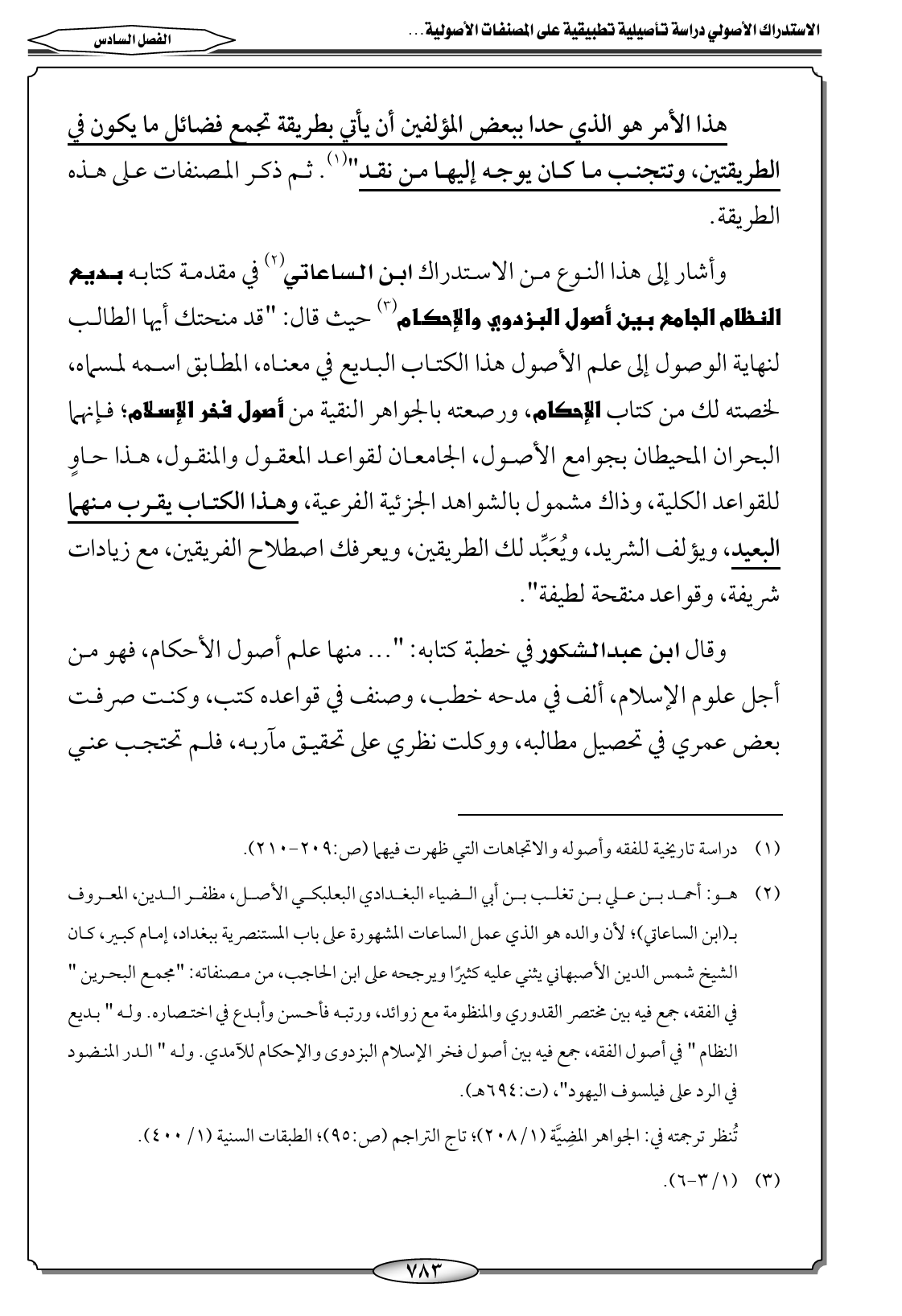 (٢) هو: أحمد بن علي بن تغلب بن أبي الضياء البغدادي البعلبكي الأصل، مظفر الدين، المعروف بـ (ابن الساعاتي)؛ لأن والده هو الذي عمل الساعات المشهورة على باب المستنصرية ببغداد، إمام كبير، كان الشيخ شمس الدين الأصبهاني يثني عليه كثيرًا ويرجحه على ابن الحاجب، من مصنفاته: "مجمع البحرين " في الفقه، جمع فيه بين مختصر القدوري والمنظومة مع زوائد، ورتبه فأحسن وأبدع في اختصاره. وله " بديع النظام " في أصول الفقه، جمع فيه بين أصول فخر الإسلام البزدوى والإحكام للآمدي. وله " الدر المنضود في الرد على فيلسوف اليهود"، (ت: ٦٩٤ هـ).