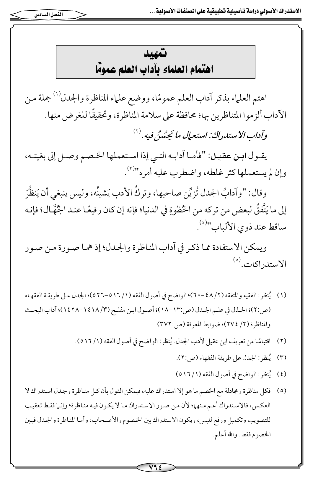 ويمكن الاستفادة مما ذكر في آداب المناظرة والجدل؛ إذ هما صورة من صور الاستدراكات. (٥)