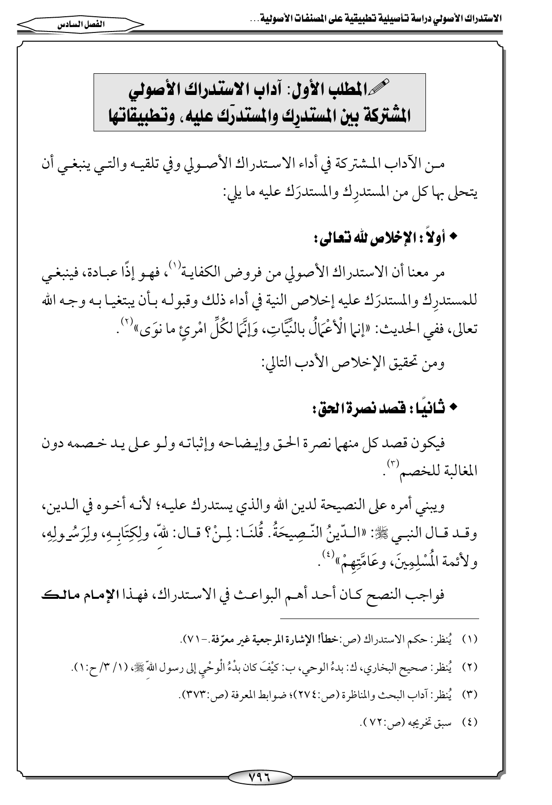 مر معنا أن الاستدراك الأصولي من فروض الكفاية (١)، فهو إذًا عبادة، فينبغي للمستدرِك والمستدرَك عليه إخلاص النية في أداء ذلك وقبوله بأن يبتغيا به وجه الله تعالى، ففي الحديث: «إنما الْأعْمَالُ بالنِّيَّاتِ، وَإنَّمَا لكُلِّ امْرئٍ ما نوَى» (٢).