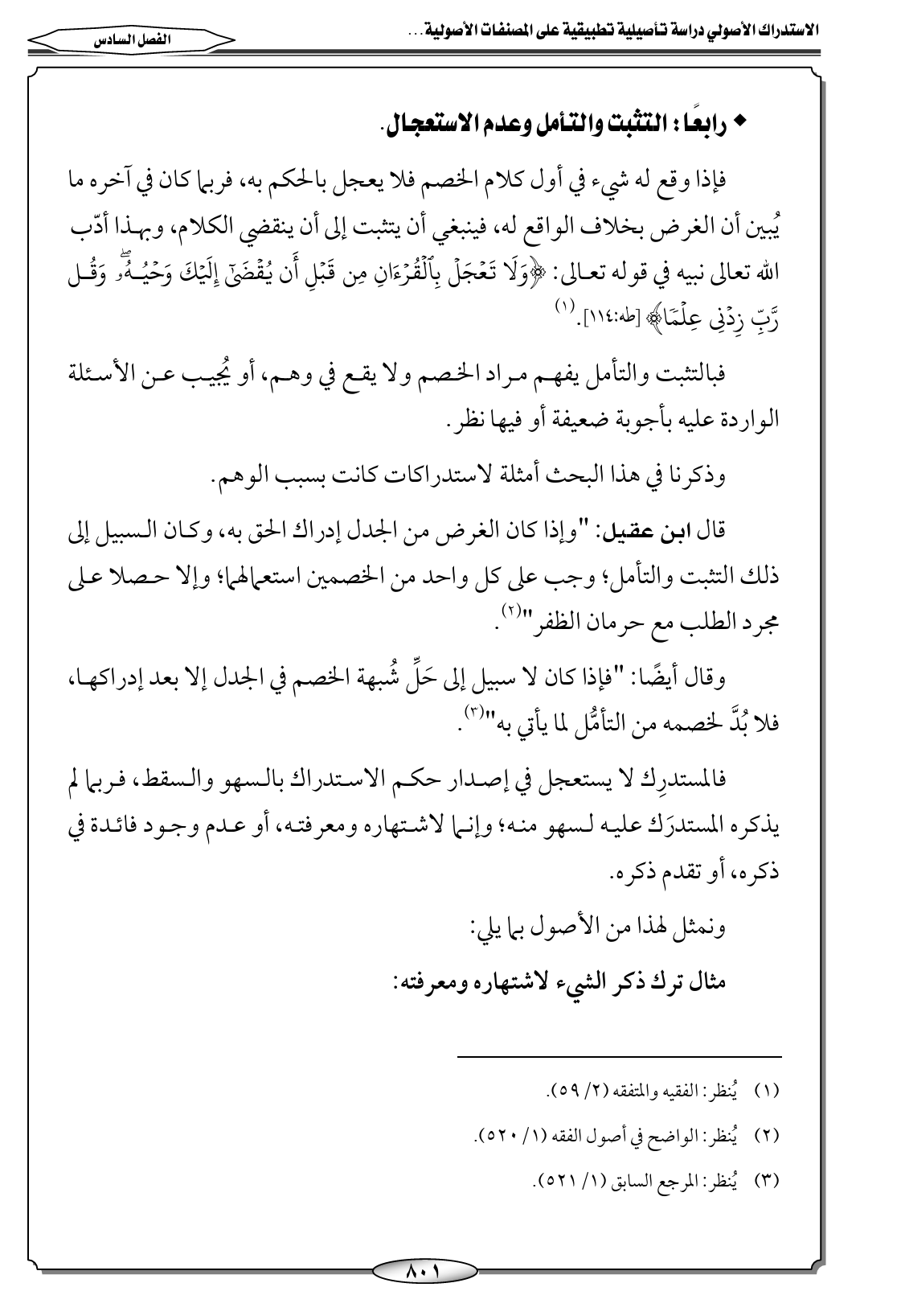 فبالتثبت والتأمل يفهم مراد الخصم ولا يقع في وهم، أو يُجيب عن الأسئلة الواردة عليه بأجوبة ضعيفة أو فيها نظر.