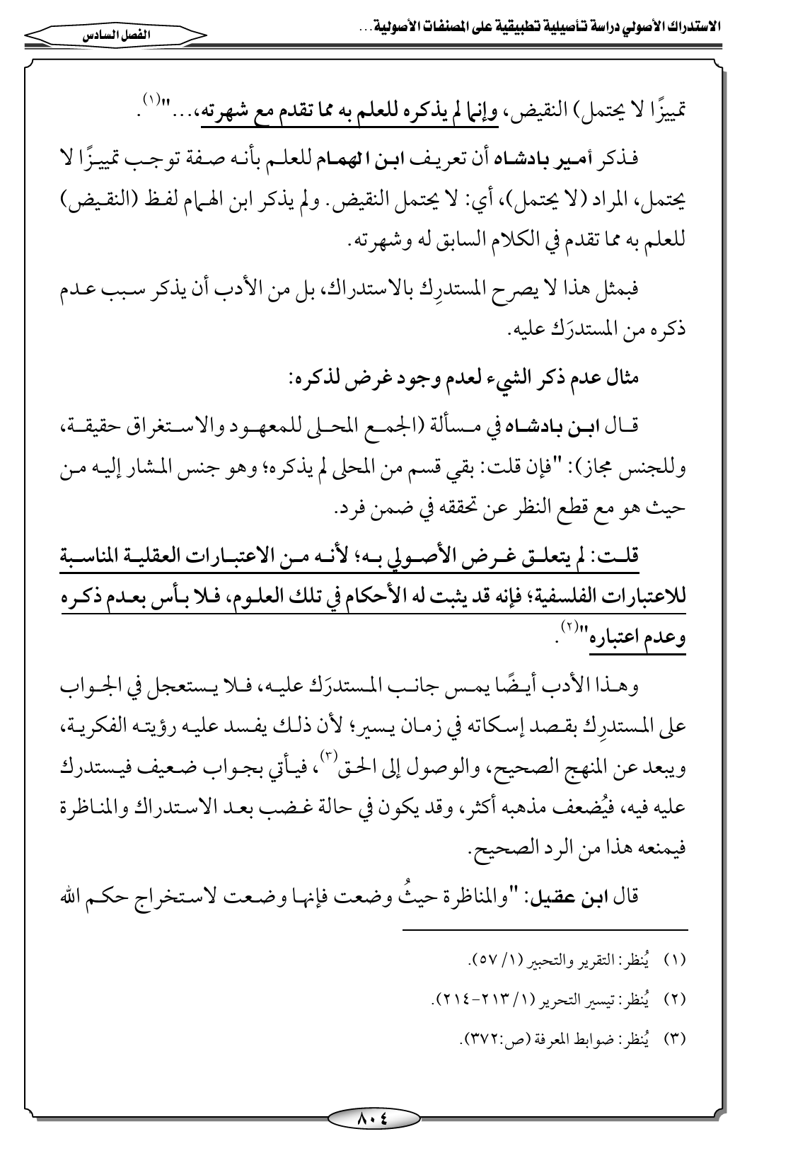 فذكر أمير بادشاه أن تعريف ابن الهمام للعلم بأنه صفة توجب تمييزًا لا يحتمل، المراد (لا يحتمل)، أي: لا يحتمل النقيض. ولم يذكر ابن الهمام لفظ (النقيض) للعلم به مما تقدم في الكلام السابق له وشهرته.