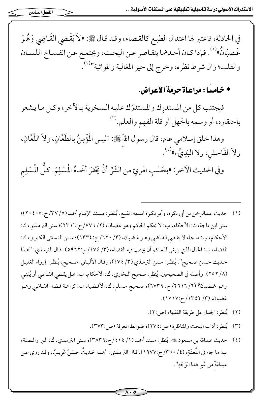 (١) حديث عبدالرحمن بن أبي بكرة، وأبو بكرة اسمه: نفيع. يُنظر: مسند الإمام أحمد (٥/ ٣٧/ح: ٢٠٤٠٥)؛ سنن ابن ماجة، ك: الأحكام، ب: لا يحكم الحاكم وهو غضبان، (٢/ ٧٧٦/ح: ٢٣١٦)؛ سنن الترمذي، ك: الأحكام، ب: ما جاء لا يقضي القاضي وهو غضبان، (٣/ ٦٢٠/ح: ١٣٣٤)؛ سنن النسائي الكبرى، ك: القضاء، ب: الحال الذي ينبغي للحاكم أن يجتنب فيه القضاء، (٣/ ٤٧٤/ح: ٥٩٦٢). قال الترمذي: "هذا حديث حسن صحيح". يُنظر: سنن الترمذي (٣/ ٤٧٤)؛ وقال الألباني: صحيح، يُنظر: إرواء الغليل (٨/ ٢٥٢). وأصله في الصحيحين: يُنظر: صحيح البخاري، ك: الأحكام، ب: هل يقضي القاضي أو يُفتِي وهو غضبان؟ (٦/ ٢٦١٦/ح: ٦٧٣٩)؛ صحيح مسلم، ك: الأقضية، ب: كراهة قضاء القاضي وهو غضبان، (٣/ ١٣٤٢/ح: ١٧١٧).