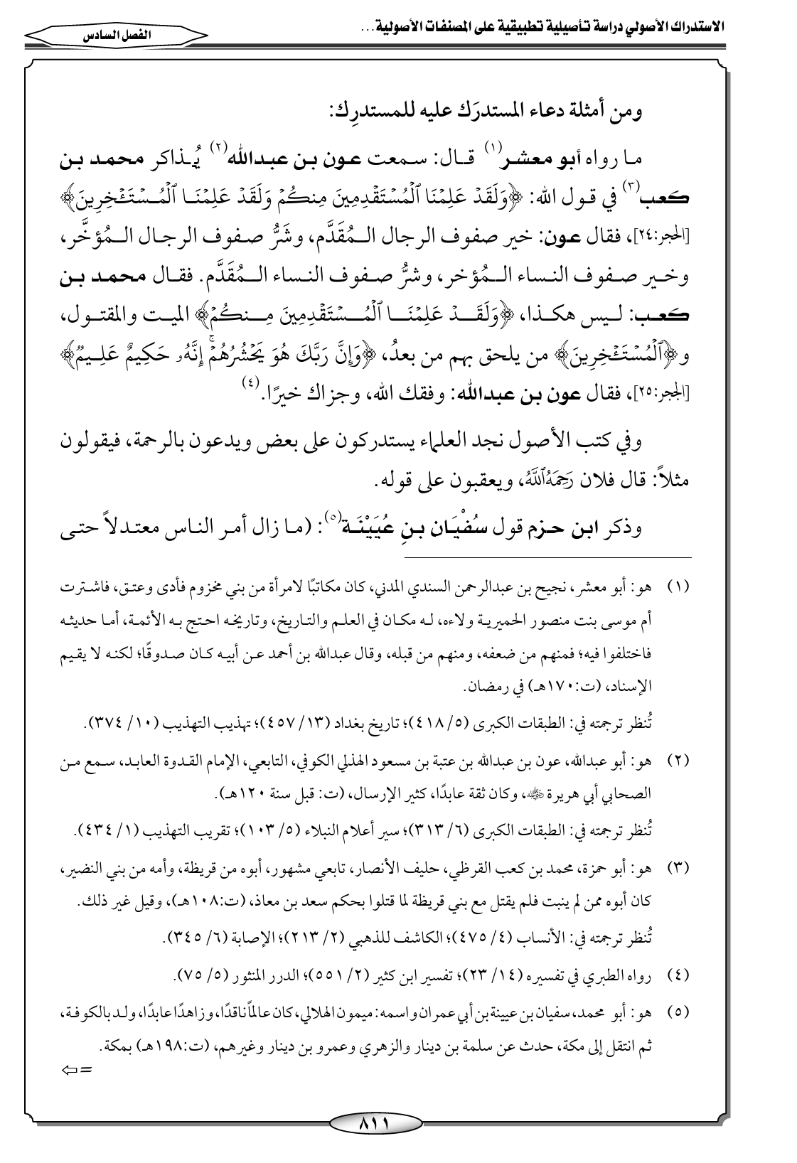 ما رواه أبو معشر (١) قال: سمعت عون بن عبدالله (٢) يُذاكر محمد بن كعب (٣) في قول الله: {وَلَقَدْ عَلِمْنَا الْمُسْتَقْدِمِينَ مِنكُمْ وَلَقَدْ عَلِمْنَا الْمُسْتَئْخِرِينَ} [الحجر: ٢٤]، فقال عون: خير صفوف الرجال المُقَدَّم، وشَرُّ صفوف الرجال المُؤخَّر، وخير صفوف النساء المُؤخر، وشرُّ صفوف النساء المُقَدَّم. فقال محمد بن كعب: ليس هكذا، {وَلَقَدْ عَلِمْنَا الْمُسْتَقْدِمِينَ مِنكُمْ} الميت والمقتول، و {الْمُسْتَئْخِرِينَ} من يلحق بهم من بعدُ، {وَإِنَّ رَبَّكَ هُوَ يَحْشُرُهُمْ إِنَّهُ حَكِيمٌ عَلِيمٌ} [الججر: ٢٥]، فقال عون بن عبدالله: وفقك الله، وجزاك خيرًا. (٤)