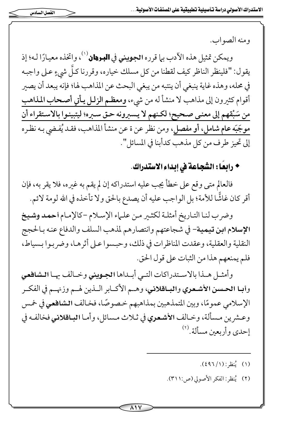 وأمثل هذا بالاستدراكات التي أبداها الجويني وخالف بها الشافعي ... وأبا الحسن الأشعري والباقلاني، وهم الأكابر الذين لهم وزنهم في الفكر الإسلامي عمومًا، وبين المتمذهبين بمذاهبهم خصوصًا، فخالف الشافعي في خمس وعشرين مسألة، وخالف الأشعري في ثلاث مسائل، وأما الباقلاني فخالفه في إحدى وأربعين مسألة. (٢)