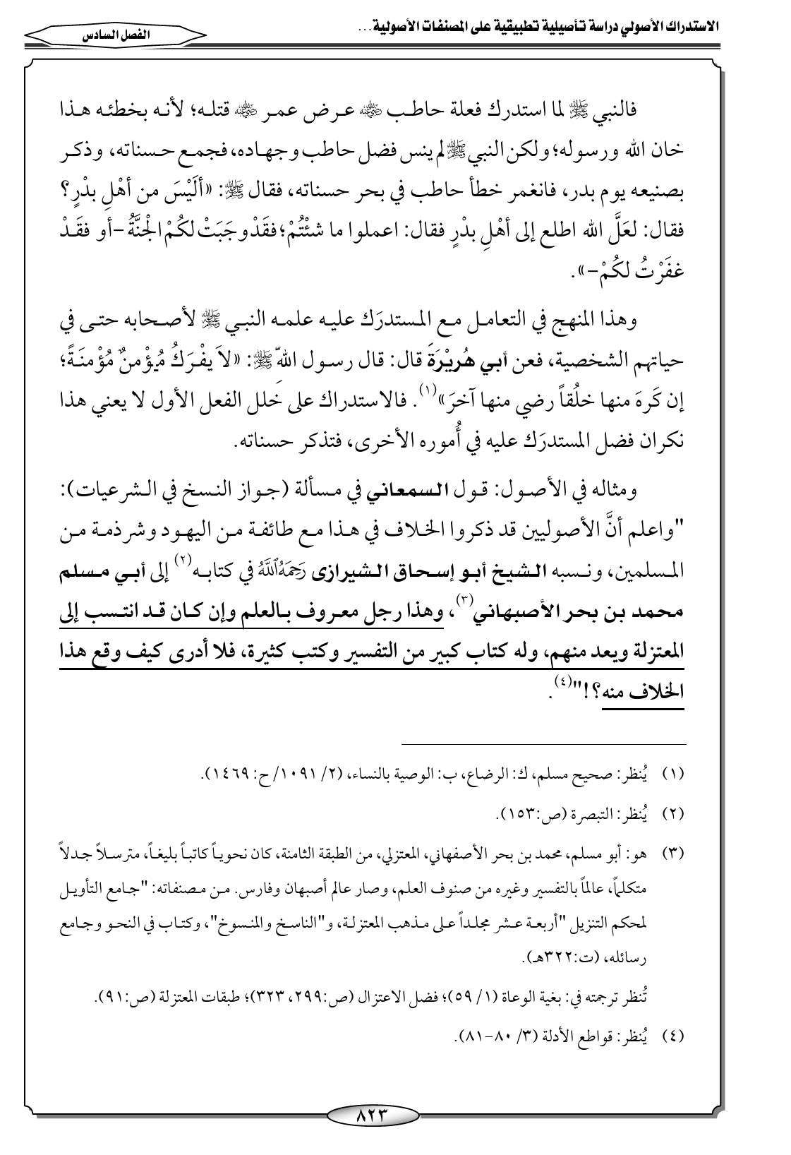 ومثاله في الأصول: قول السمعاني في مسألة (جواز النسخ في الشرعيات): "واعلم أنَّ الأصوليين قد ذكروا الخلاف في هذا مع طائفة من اليهود وشرذمة من المسلمين، ونسبه الشيخ أبو إسحاق الشيرازى - رحمه الله - في كتابه (٢) إلى أبي مسلم محمد بن بحر الأصبهاني (٣)،