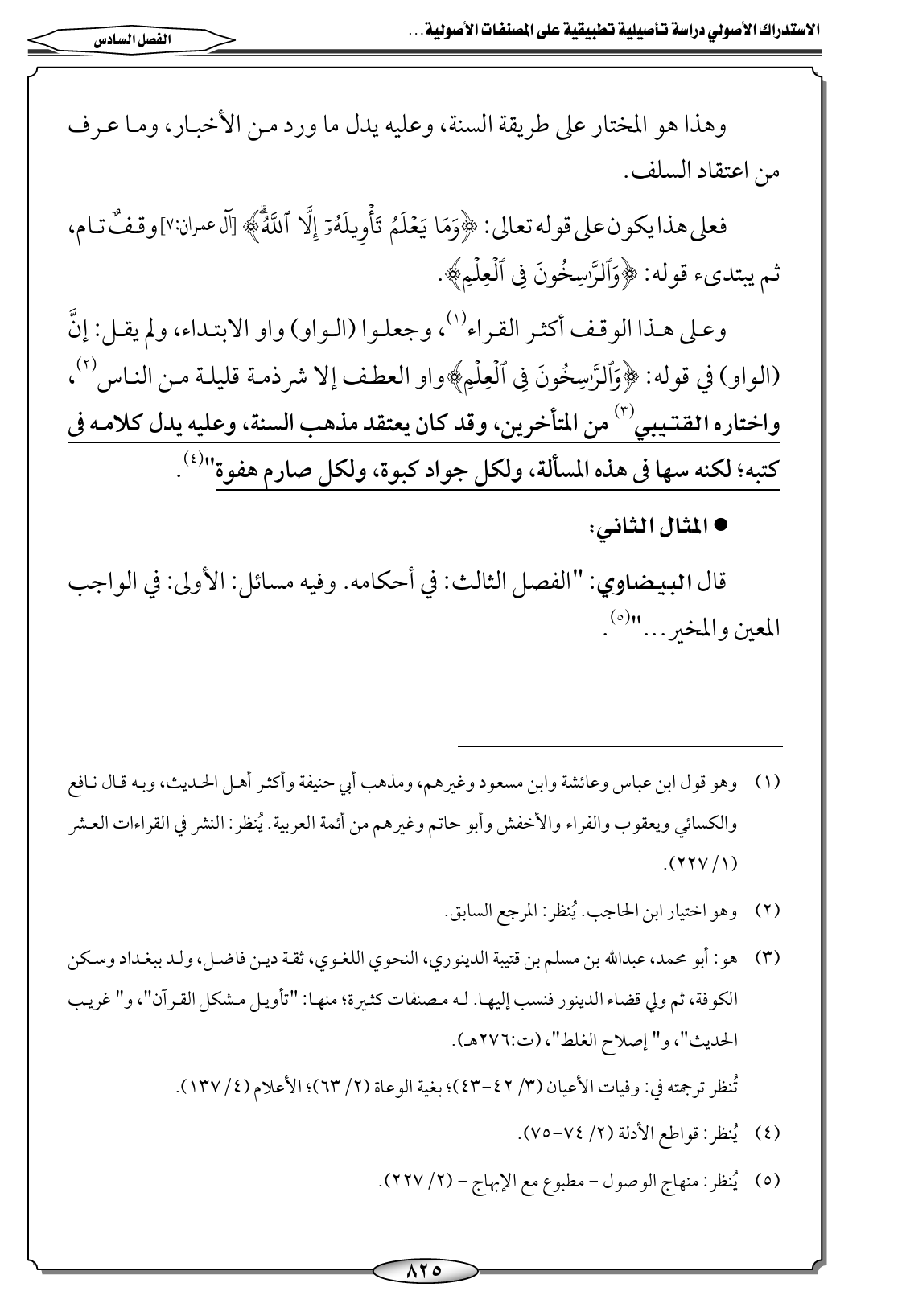 وعلى هذا الوقف أكثر القراء (١)، وجعلوا (الواو) واو الابتداء، ولم يقل: إنَّ (الواو) في قوله: {وَالرَّاسِخُونَ فِي الْعِلْمِ} واو العطف إلا شرذمة قليلة من الناس (٢)، واختاره القتيبي (٣) من المتأخرين، وقد كان يعتقد مذهب السنة، وعليه يدل كلامه فى كتبه؛ لكنه سها فى هذه المسألة، ولكل جواد كبوة، ولكل صارم هفوة" (٤).
