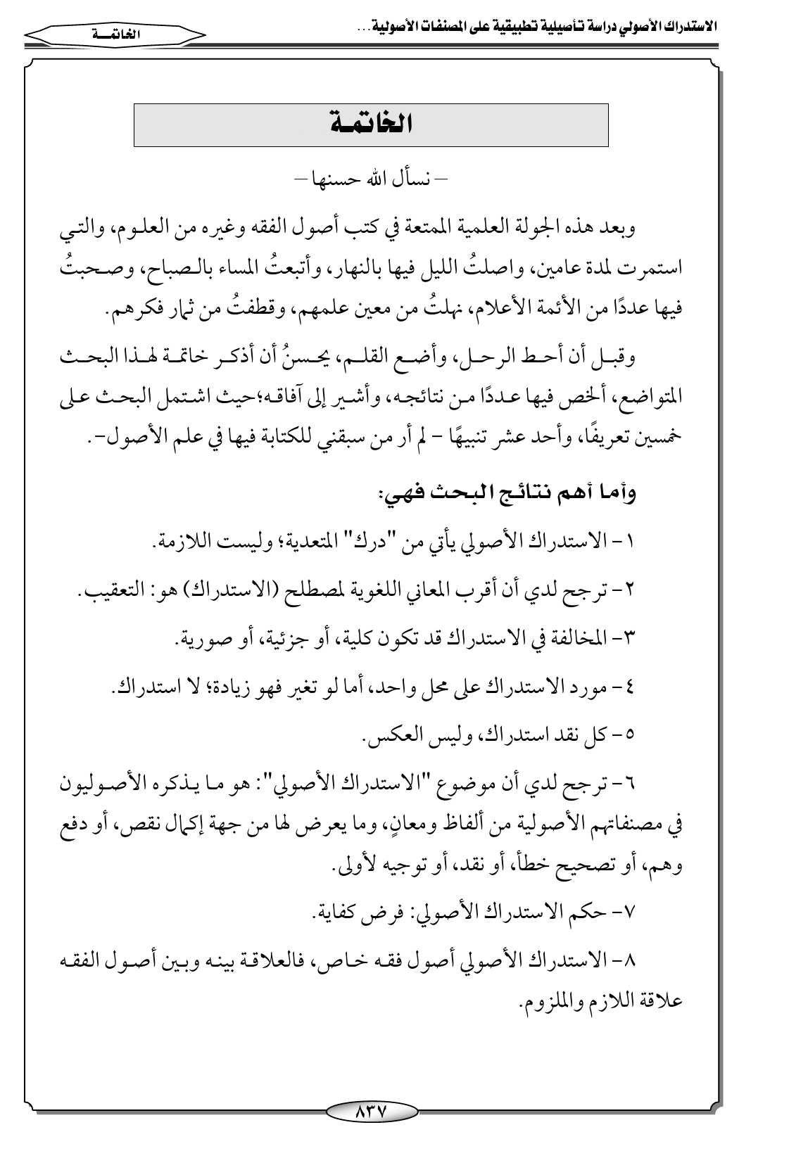 ٦ - ترجح لدي أن موضوع "الاستدراك الأصولي": هو ما يذكره الأصوليون في مصنفاتهم الأصولية من ألفاظ ومعانٍ، وما يعرض لها من جهة إكمال نقص، أو دفع وهم، أو تصحيح خطأ، أو نقد، أو توجيه لأولى.