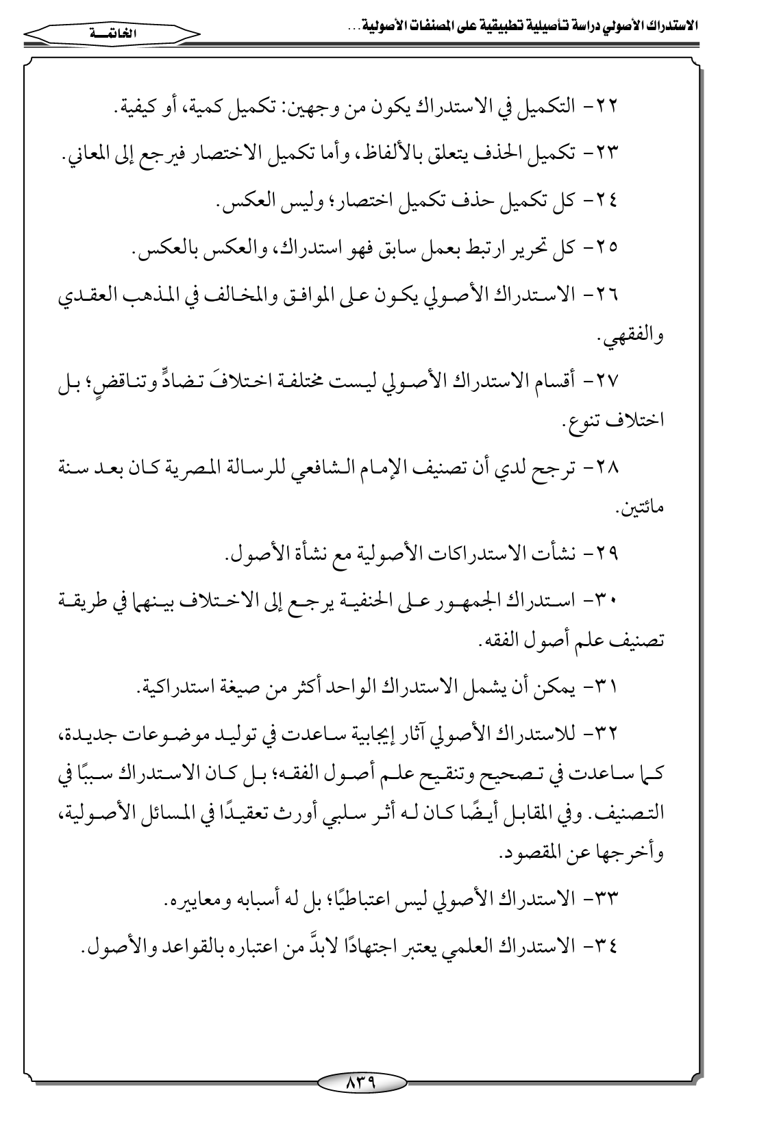 ٣٢ - للاستدراك الأصولي آثار إيجابية ساعدت في توليد موضوعات جديدة، كما ساعدت في تصحيح وتنقيح علم أصول الفقه؛ بل كان الاستدراك سببًا في التصنيف. وفي المقابل أيضًا كان له أثر سلبي أورث تعقيدًا في المسائل الأصولية، وأخرجها عن المقصود.