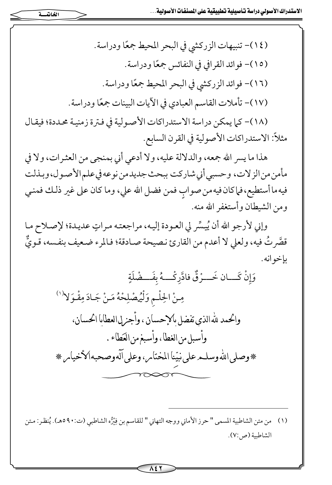 هذا ما يسر الله جمعه، والدلالة عليه، ولا أدعي أني بمنجى من العثرات، ولا في مأمن من الزلات، وحسبي أني شاركت ببحث جديد من نوعه في علم الأصول، وبذلت فيه ما أستطيع، فما كان فيه من صوابٍ فمن فضل الله علي، وما كان على غير ذلك فمني ومن الشيطان وأستغفر الله منه.
