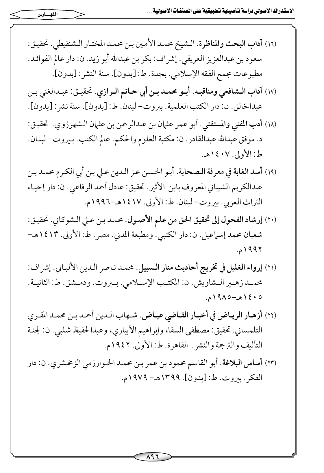 (١٨) أدب المفتي والمستفتي. أبو عمر عثمان بن عبدالرحمن بن عثمان الشهرزوي. تحقيق: د. موفق عبدالله عبدالقادر. ن: مكتبة العلوم والحكم. عالم الكتب. بيروت- لبنان. ط: الأولى. ١٤٠٧ هـ.