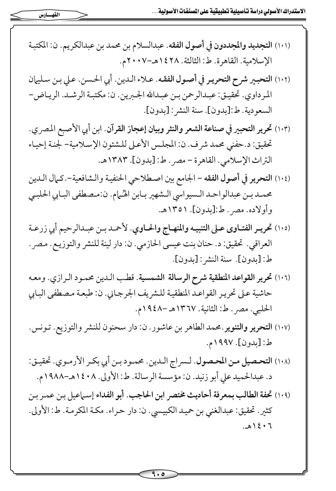 (١٠٢) التحبير شرح التحرير في أصول الفقه. علاء الدين. أبي الحسن. علي بن سليمان المرداوي. تحقيق: عبدالرحمن بن عبدالله الجبرين. ن: مكتبة الرشد. الرياض- السعودية. ط: [بدون]. سنة النشر: [بدون].