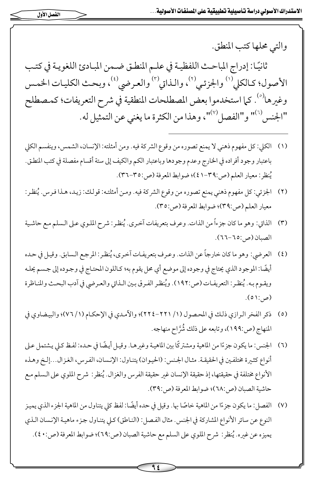 ثانيًا: إدراج المباحث اللفظية في علم المنطق ضمن المبادئ اللغوية في كتب الأصول؛ كالكلي (١) والجزئي (٢)، والذاتي (٣) والعرضي (٤)، وبحث الكليات الخمس وغيرها (٥). كما استخدموا بعض المصطلحات المنطقية في شرح التعريفات؛ كمصطلح "الجنس (٦) " و"الفصل (٧)