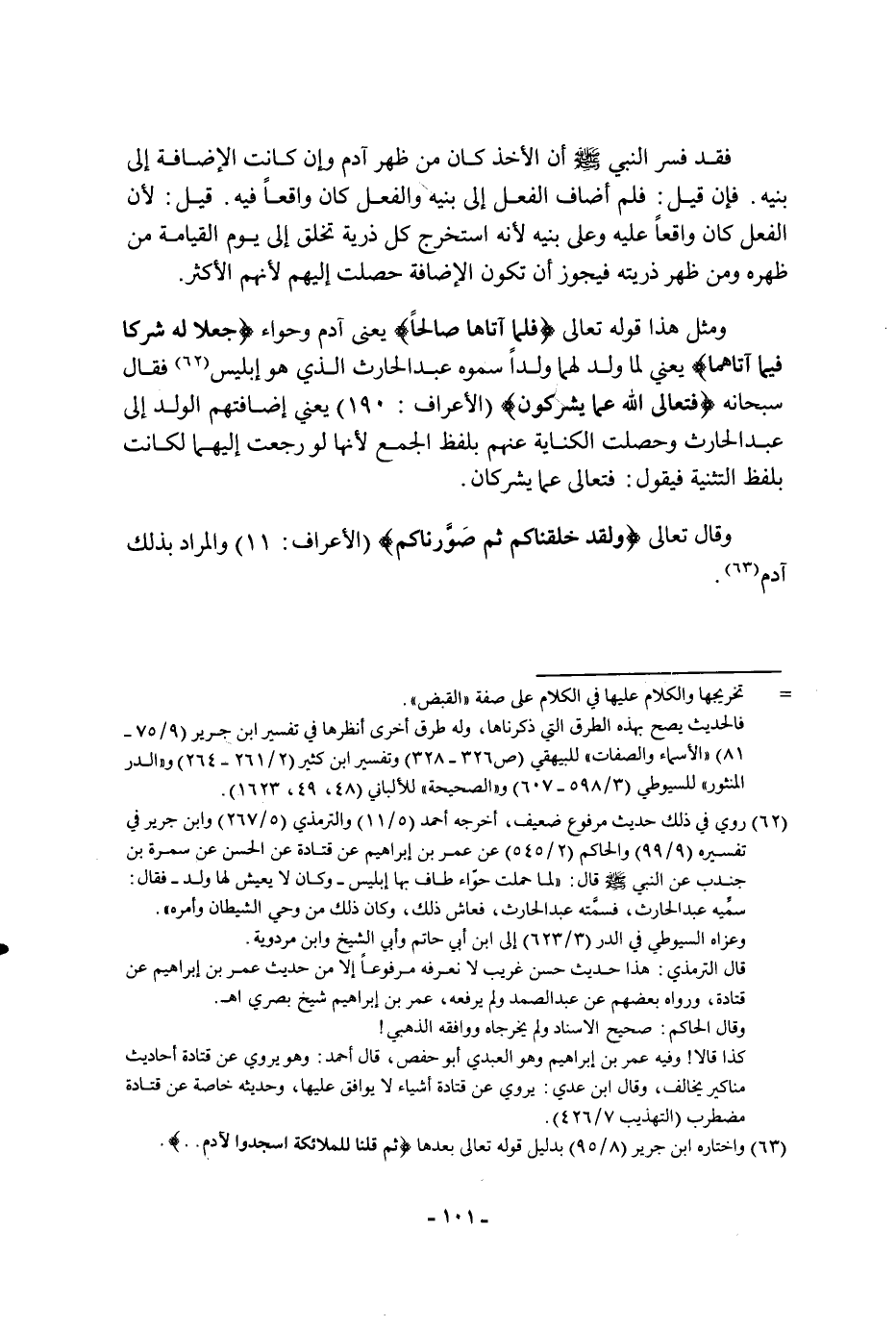 فقد فسر النبي، صَلَّى اللَّهُ عَلَيْهِ وَسَلَّمَ، أن الأخذ كان من ظهر آدم، وإن كانت الإضافة إلى بنيه فإن قيل: فلم أضاف الفعل إلى بنيه والفعل كان واقعا فيه قيل: لأن الفعل كان واقعا عليه وعلى بنيه لأنه استخرج كل ذرية تخلق إلى يوم القيامة من ظهره ومن ظهر ذريته، فيجوز أن تكون الإضافة حصلت إليهم لأنهم الأكثر ومثل هَذَا قوله تَعَالَى: {فَلَمَّا آتَاهُمَا صَالِحًا} يعني آدم وحواء {جَعَلا لَهُ شُرَكَاءَ فِيمَا آتَاهُمَا} يعني: لما ولد لهما ولدا سموه عبد الحارث الذي هو إبليس، فقال سُبْحَانَهُ: {فَتَعَالَى اللَّهُ عَمَّا يُشْرِكُونَ} يعني: إضافتهم الولد إلى عبد الحارث، وحصلت الكناية عنهم بلفظ الجمع لأنها لو رجعت إليهما لكانت بلفظ التثنية فيقول: فتعالى عما يشركان وقال تَعَالَى: {وَلَقَدْ خَلَقْنَاكُمْ ثُمَّ صَوَّرْنَاكُمْ} والمراد بذلك آدم
