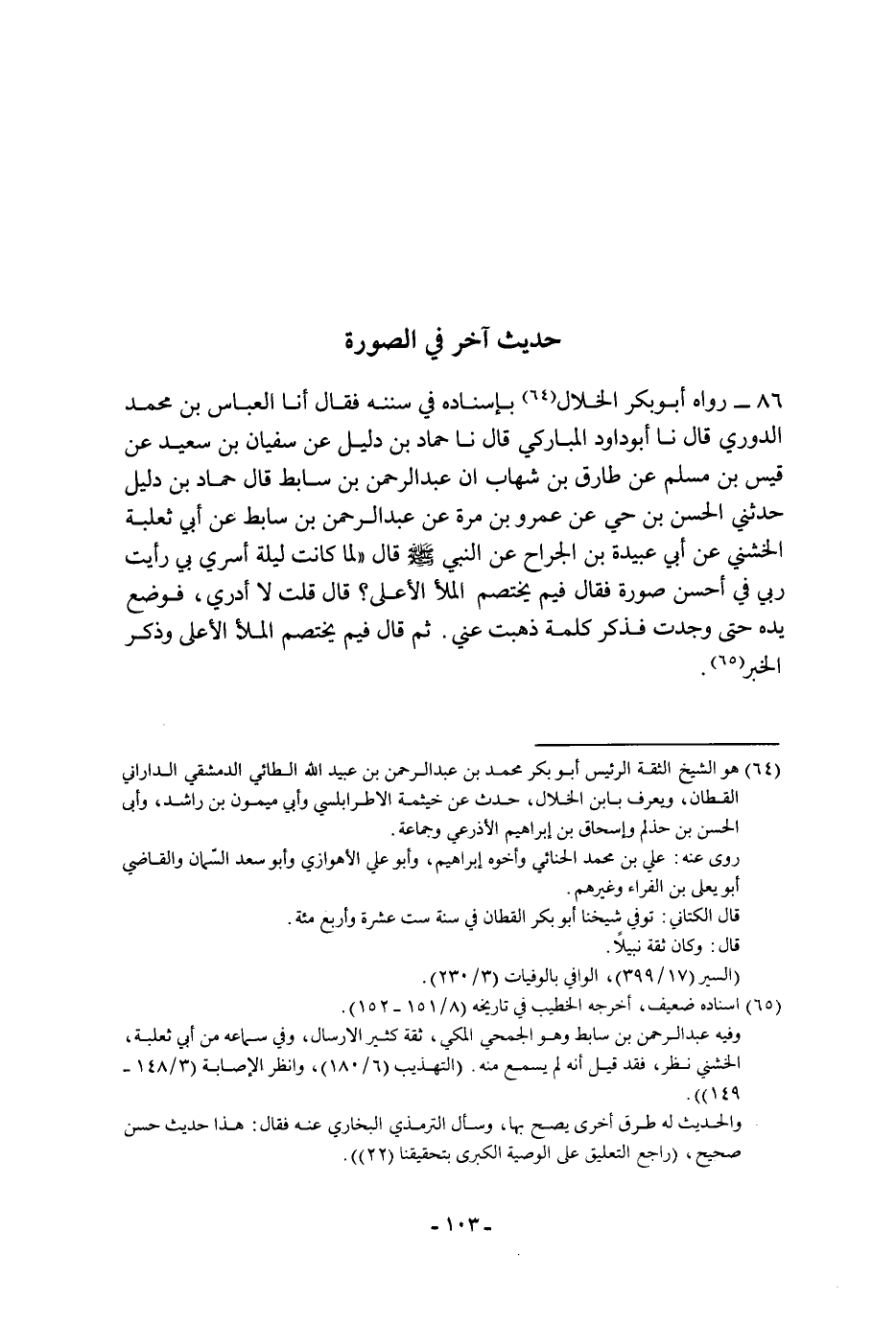 ٨٦ - رَوَاهُ أَبُو بَكْرٍ الْخَلالُ بِإِسْنَادِهِ فِي سُنَنِهِ، فَقَالَ: أنا الْعَبَّاسُ بْنُ مُحَمَّدٍ الدُّورِيُّ، قَالَ: نا أَبُو دَاوُدَ الْمُبَارَكِيُّ، قَالَ: نا حَمَّادُ بْنُ دُلَيْلٍ، عَنْ سُفْيَانَ بْنِ سَعِيدٍ، عَنْ قَيْسِ بْنِ مُسْلِمٍ، عَنْ طَارِقِ بْنِ شِهَابٍ، أَوْ عَبْدَ الرَّحْمَنِ بْنَ سَابِطٍ، قَالَ: نا حَمَّادُ بْنُ دُلَيْلٍ، وَحَدَّثَنِي الْحَسَنُ بْنُ حَيٍّ، عَنْ عَمْرِو بْنِ مُرَّةَ، عَنْ عَبْدِ الرَّحْمَنِ بْنِ سَابِطٍ، عَنْ أَبِي ثَعْلَبَةَ الْخُشَنِيِّ، عَنْ أَبِي عُبَيْدَةَ بْنِ الْجَرَّاحِ، عَنِ النَّبِيِّ، صَلَّى اللَّهُ عَلَيْهِ وَسَلَّمَ، قَالَ: " لَمَّا كَانَتْ لَيْلَةُ أُسْرِيَ بِي رَأَيْتُ رَبِّي فِي أَحْسَنِ صُورَةٍ، فَقَالَ: فِيمَ يَخْتَصِمُ الْمَلأُ الأَعْلَى؟ قَالَ: قُلْتُ: لا أَدْرِي، فَوَضَعَ يَدَهُ حَتَّى وَجَدْتُ فَذَكَرَ كَلِمَةً ذَهَبَتْ عَنِّي ثُمَّ قَالَ: فِيمَ يَخْتَصِمُ الْمَلأُ الأَعْلَى، وَذَكَرَ الْخَبَر